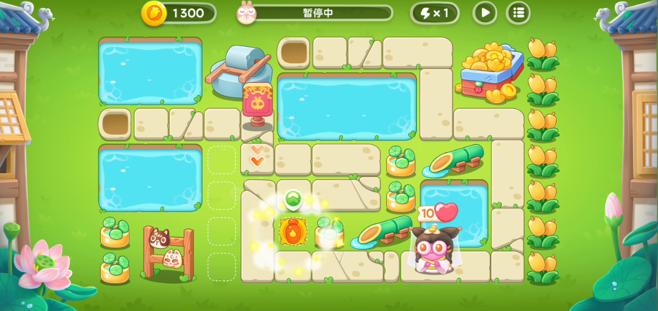 看了别人的视频,用的是鱼刺通关,那我鱼刺就不打了,直接挑战极限卖了鱼刺上瓶子炮,一共也就打了17次而已。最大的困扰在于瓶子虽然攻速快,但是攻击力太低,输出不够,那就必须多造炮塔,造炮塔需要钱,每一关就那么些怪那么些建筑打完了金币数量是固定的,多余经济又从哪里来,我就瞄上了水里面漂走的一朵朵花。 整关都是难点,一直在赶时间,既要打快点又不敢放开了打,很多次都是卡着经济先不造炮塔,只要怪能打完钱就先留着。先说拆建筑的顺序,光怎么拆我就研究了好几次,个人认为这是敲掉建筑最合理的顺序,在第一朵花漂走之前必须打掉下面那个篮子,并且再出两个炮塔才能集火打掉花(这里会有一个意外情况,就是下面会放跑一只老六,所以打掉篮子的时间,绝对不能晚于老六跑出打掉篮子之后新造瓶子炮的攻击范围),随后在所有花漂过第二个桥的出了桥左边攻击范围之后再集火;再下来说打怪,前两波必须放怪才能保证敲建筑的速度,第二波既要卡炮塔转动的时间还要控血到三下之内;最难的是后两波需要手动锁定打怪顺序,及时平均兔子血量。这一把前面还有两次,一次9波跑一只,一次10波跑一只,证明这关的单通不是偶然的,是可操作的。 整关打下来有惊有险,非常恶心,不过和43关比起来还差了不少。