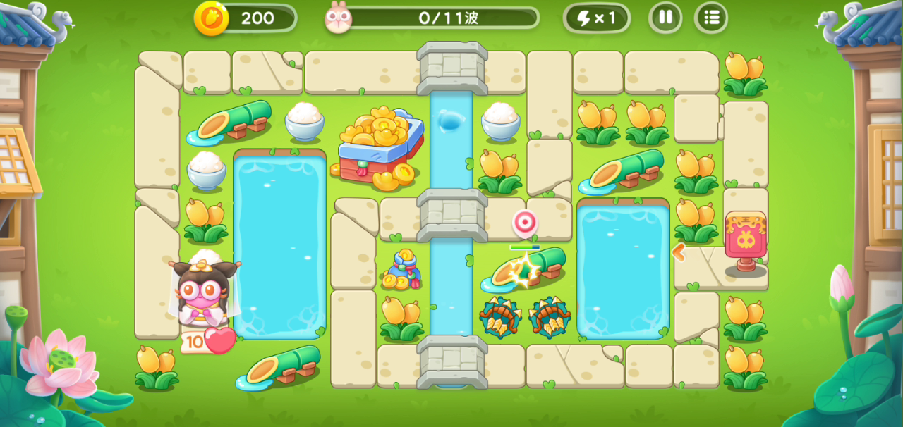 这关打的比较极限,试了5次才过,难点在第一只端盘子的加速后输出不够留不住,需要升三级回旋镖,然后顺着拆,铺满后就等过关