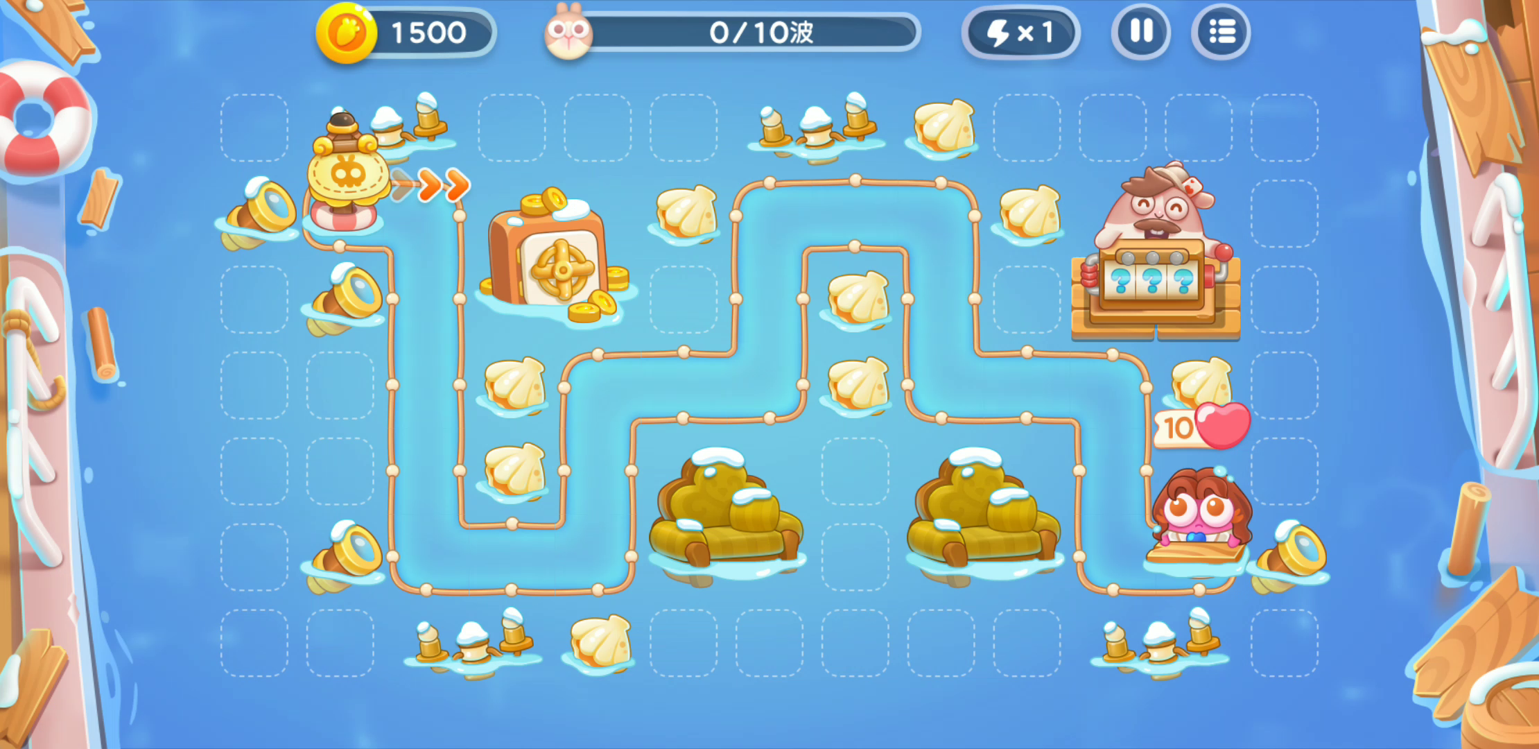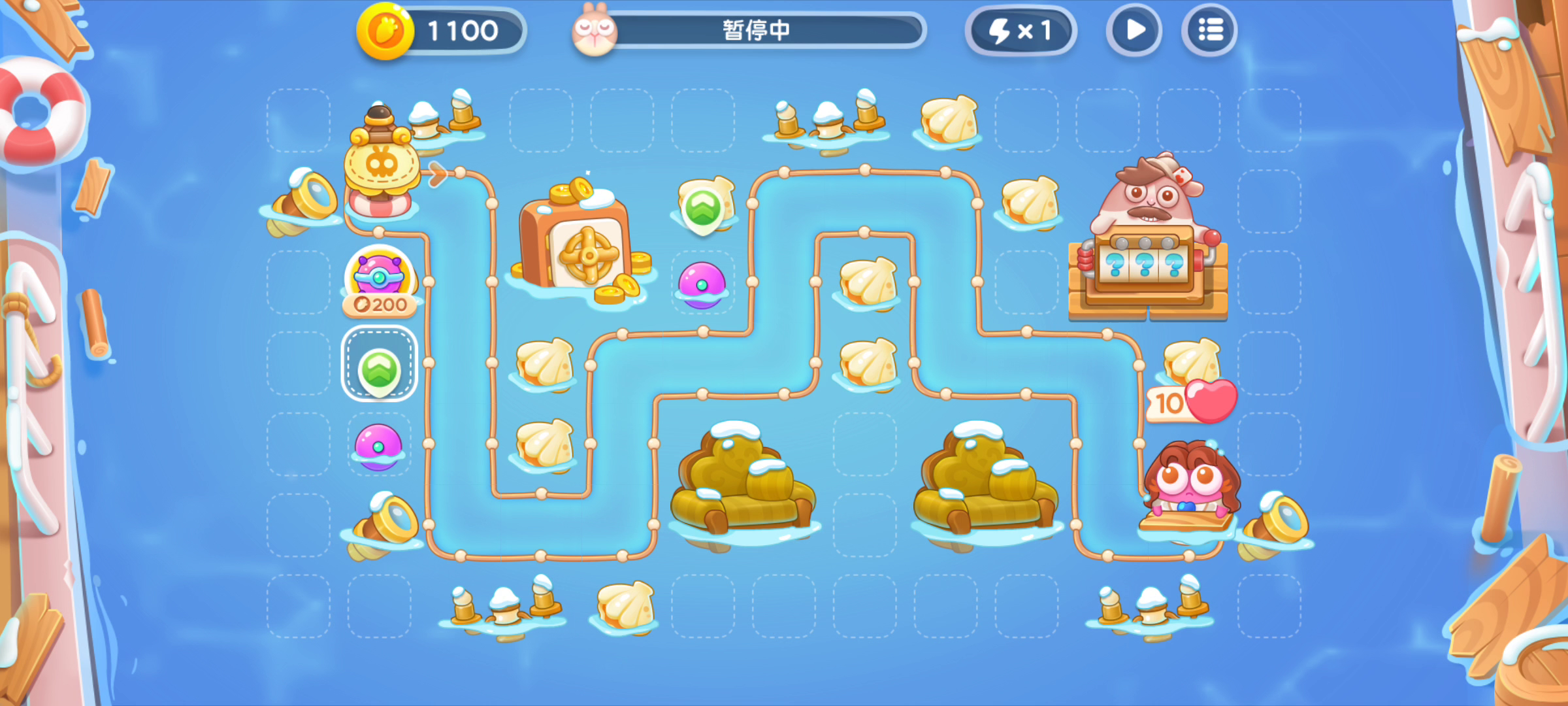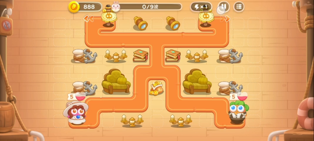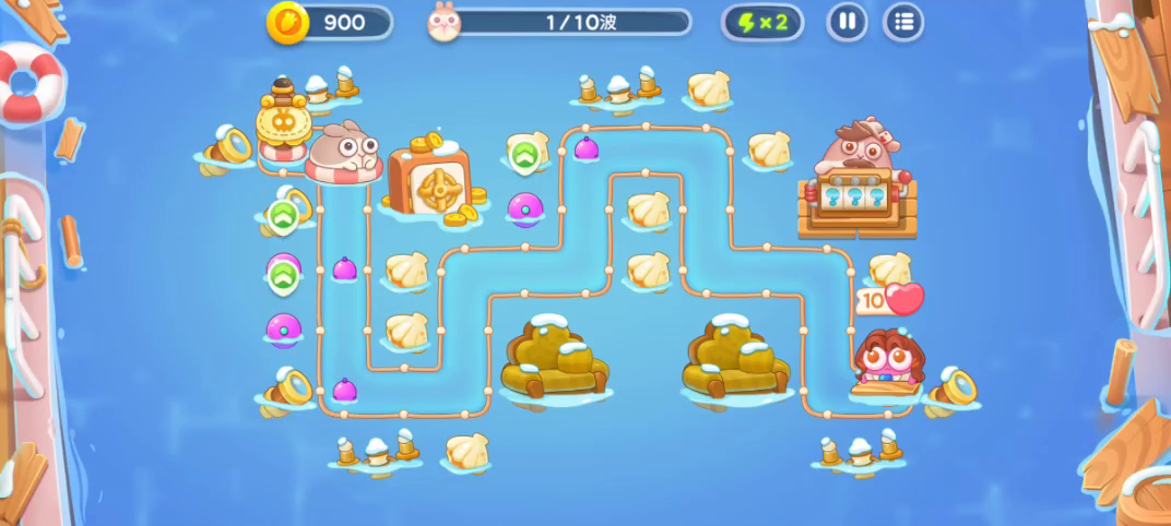一开始真的整的很无语😂几乎所有炮塔都分到了左边 ,形成了一个上面打不着,右边也打不着道具的局面。只能花钱消灾,把不需要的位置用鱼雷填起来。