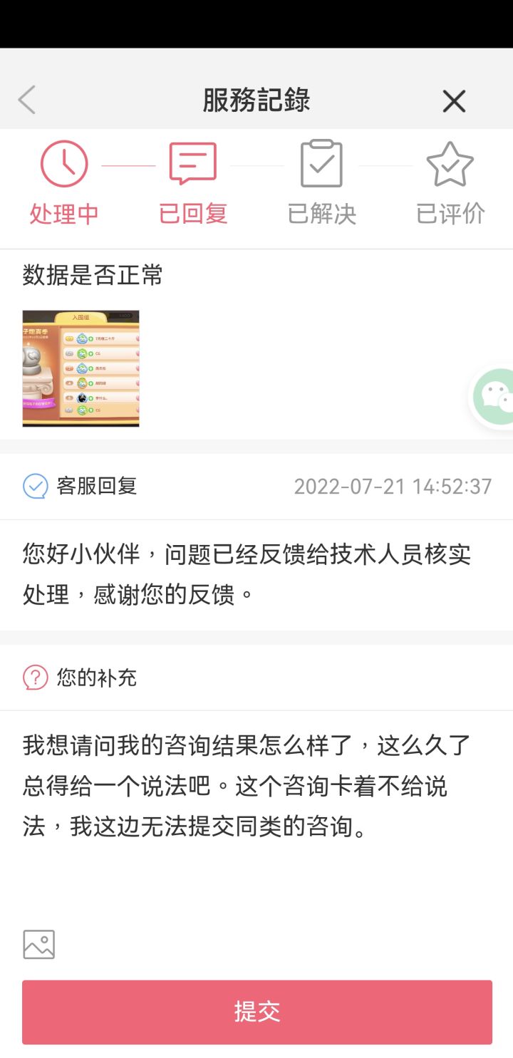 我希望官方在设计游戏反馈机制的时候能够动动脑子,实在不行可以借鉴下其他家的设计,或者说这玩意行业内基本都是有现成的了,不指望能做出新意,至少不要更烂吧?游戏咨询时,如果前次咨询的同一个类别的问题客服没结案,那你就不能提下一个问题。搞半天这个游戏反馈机制还是个单线程的,长期不结案的也不给一个超期自动关闭,合着就在这里卡BUG。
