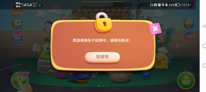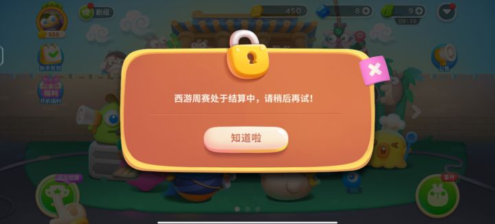 跟着游戏进度提示走,提示可以参加周赛。跳转过来后,如图1显示,然后就一直在这个画面,关掉以后回到图2,也不能进行其他操作,还是只能点击左下角。那只能等着你结算完成,其他啥也不能做?关键啥时候结算完成咱也不知道呀