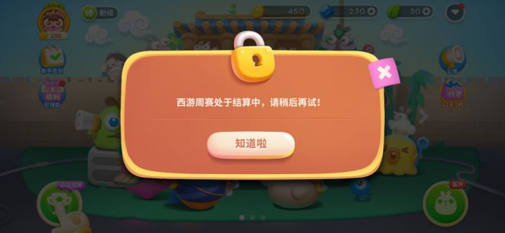 西游赛在结算,教程跳不过去,其他也点不了,晚上打保卫萝卜怎么了,话说这个西游赛啥时候开,不然我玩不了了呀
