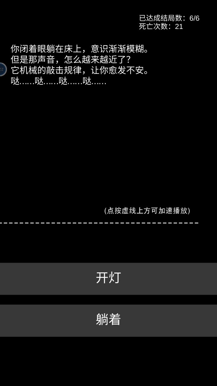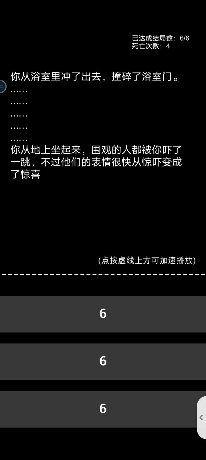 死这多次才把六个结局打出来😑😤😤😤就最后在第三个结局死了八九次😡😡挺好玩的,不是蛮难