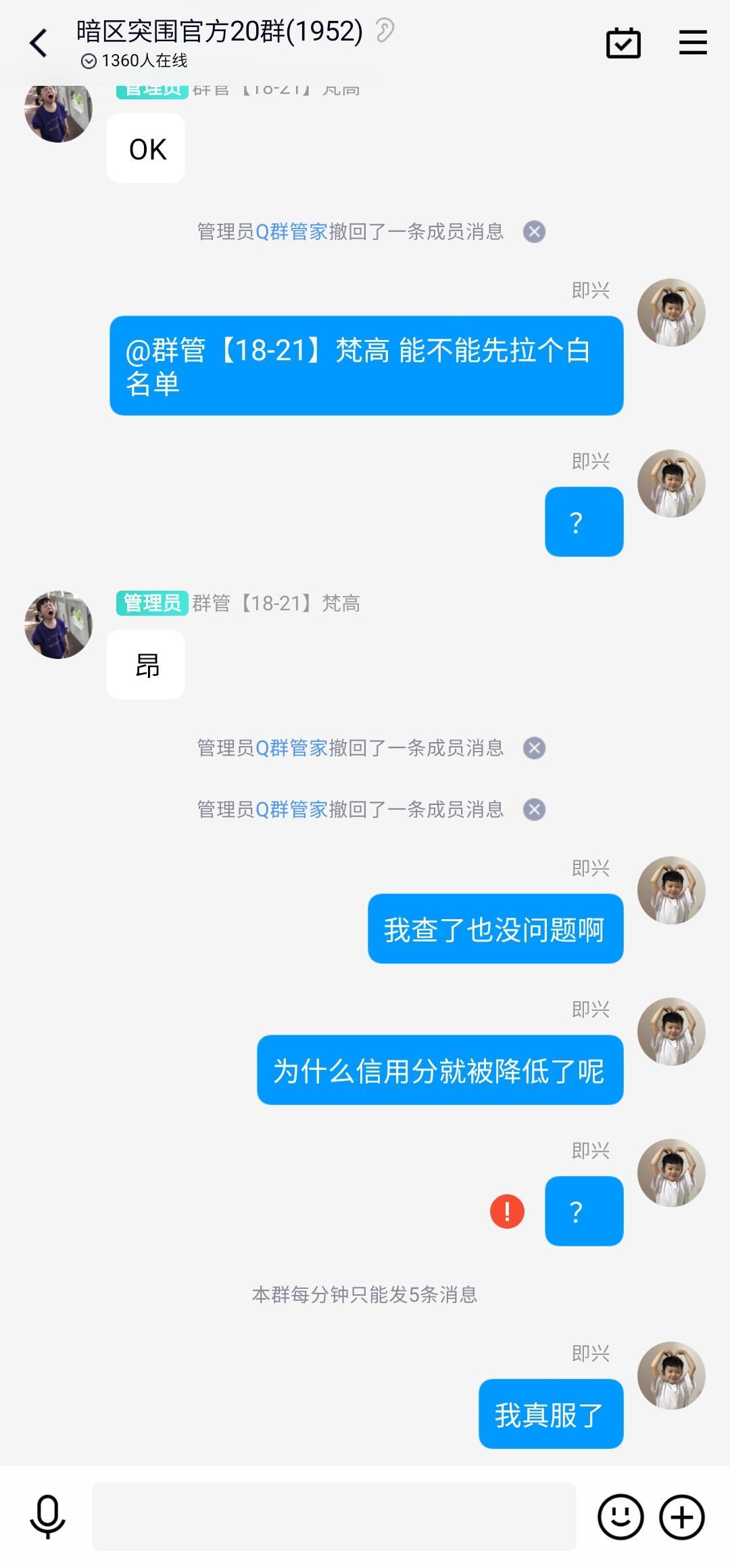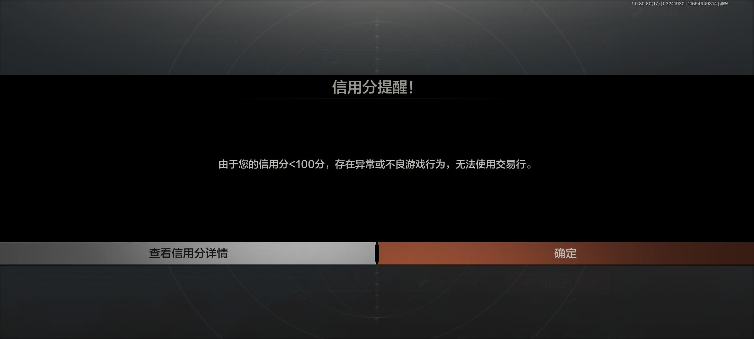 3月24日下午四点半左右我登录上号,准备出售东西时候突然提示信用分不足一百禁止出售,然后查询也没有任何违规记录,官方群反馈没有结果,群管全部不回信息,官方qq账号也不回信息,希望官方看到了赶紧给我一个答复