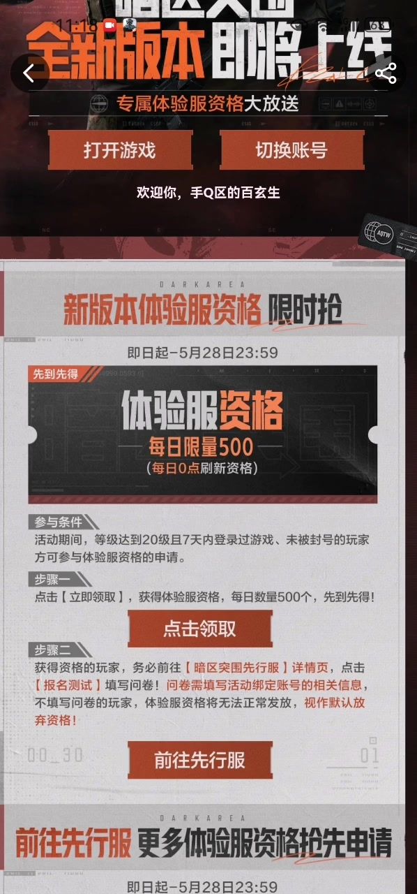 亲爱的暗区先锋:感谢您对《暗区突围》的关注和支持。我们全新版本的体验服测试计划已开启(安卓与iOS均会开放),同时开放QQ与微信平台体验服,诚邀热爱《暗区突围》的各位先锋报名参与体验服测试。 本次先锋们可以通过以下方式获得体验服测试名额:招募问卷填写(即日起至5月28日23:59,招募截止后的提交均无效)>>>>>>报名方式:第一步:前往暗区突围先行服专题页面第二步:点击报名测试按钮