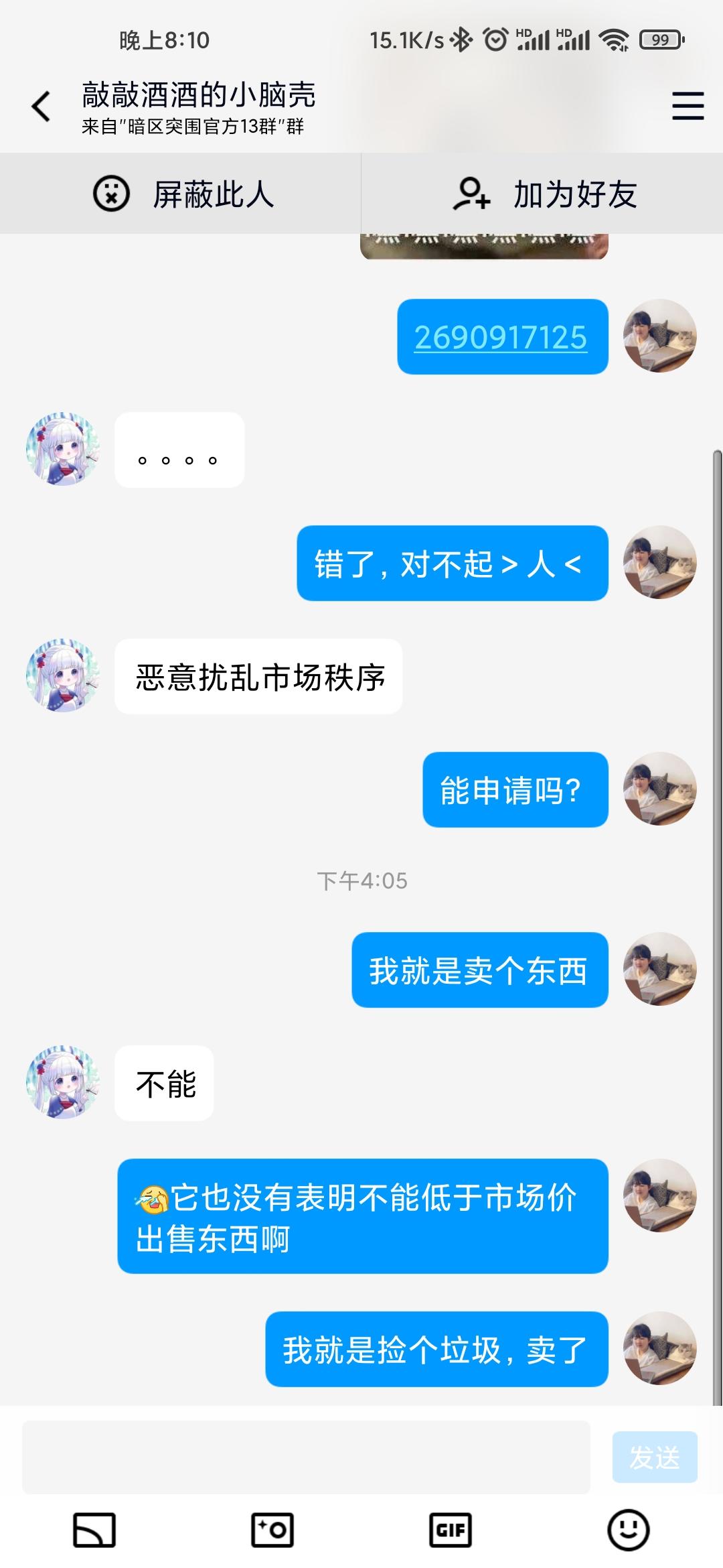 我真的有点无语了,我正常出售东西,你说卖东西肯定是低于市场价才能卖出去,我也没低多少,就低一块钱,这放在现实生活中都不算扰乱市场价格,凭啥我正常卖东西给我封号?请问你们哪条服务规则上写着不允许低价出售东西,扰乱市场价格有个限度吧?我地一块钱也算扰乱市场价格?你们这bug也太明显了吧?还有就是如果找到一个上架非常少的物品,一次全部扫空以后,可以自己制定市场价格,这bug你们不管,你们来封一个捡垃圾的玩家?你们就是这么运营游戏的?产品经理从哪个学校毕业的?别给自己学校丢人了,辞职吧你!