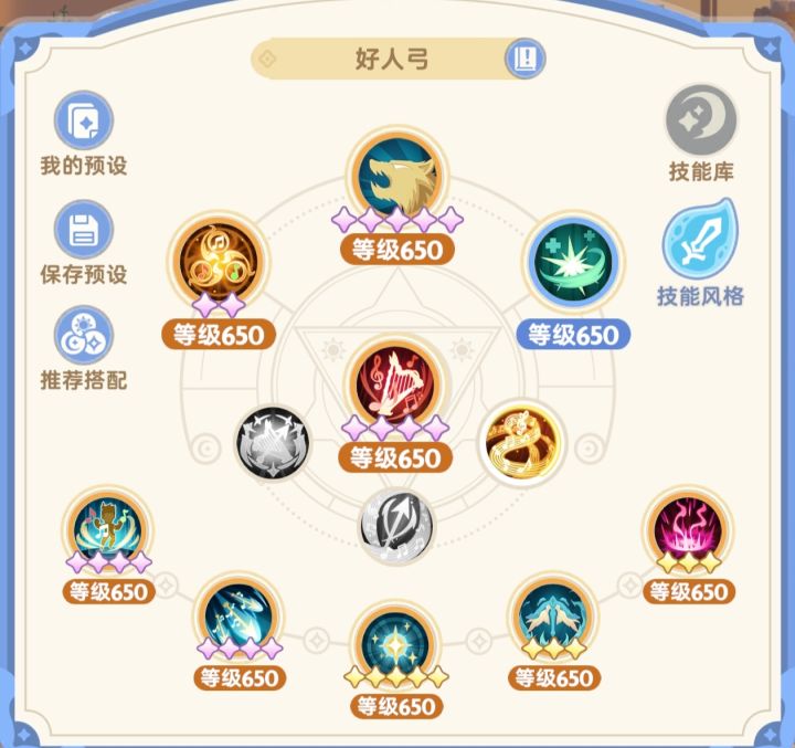 战术技能:野性怒吼,妖精密语,八转专属战术(必带)被动技能:每次转职的专属技能天赋:四转右线(必带),加速冷却,断点重连其他技能:只带每次转职的专属技能,最好是金四,冷却缩减拉满!八转游侠也是好起来了,竟然有辅助风格,真的耗丸。四转游侠右线提供高额冷却缩减!野性怒吼增加急速,用过的都说好!妖精密语给怪物上debuff,大佬的伤害就是我的伤害!这全套大保健都掏出来,称呼一声弓爷不过分