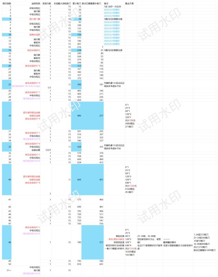 新增图一(2025年五一版本的塔莎)文档导出图片还要收VIP钱,所以清晰度和水印有问题有错误可及时反馈!—————————⬇️这些是图二内容(常规塔莎)O列表示大奖层第一个大奖就出需要的幸运儿的保底,Q列表示30、35、40层第三个大奖才出想要的倒霉蛋的终极大保底。已知小层保底15次,大奖保底18次,每层36个坑位。L列奖励的选择仅代表个人见解,你想选别的也可以。策