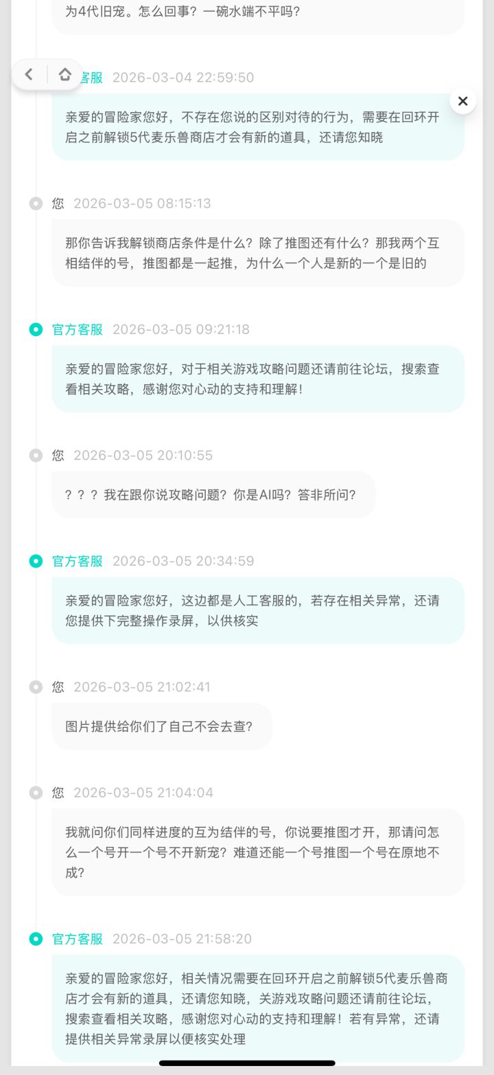 前几天忙,一直到今天才发贴。事情很简单:这周1区只要跟上进度周二(3月3日)都能达到132级,推图则开5代宠物,忆战回环周三开启商店同步更新5代宠物宝箱。本人1区四个号ABCD分别AB互为结伴,CD互为结伴。2026年3月3日晚达到十转132级(可看最后两张截图倒推。截图时间为3月4日晚22:30左右,未吃经验药,有月卡经验加成),可开启5代宠物。结伴机制要求俩人同时推图才能开新关卡,所以同