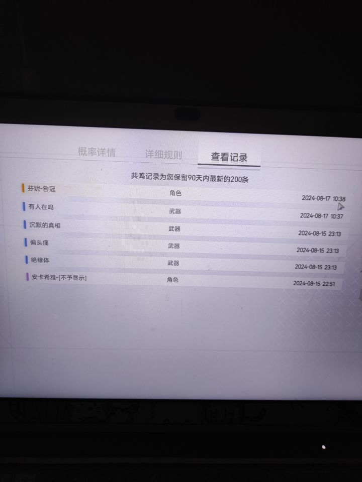 目前就这几个五星,新出这个龙舌兰或者晨星要不要抽,试玩感觉一般,要不要等琴诺,目前不歪池89抽,武器池17,等琴诺的话应该可以攒0+1PS:群问题到底是什么,为什么死活加不进去#尘白禁区抽卡