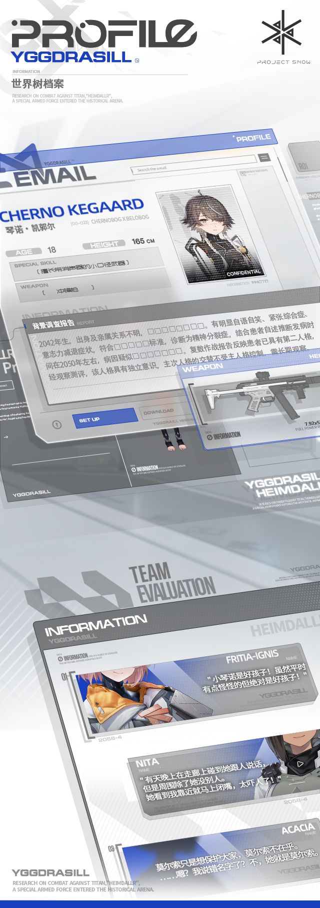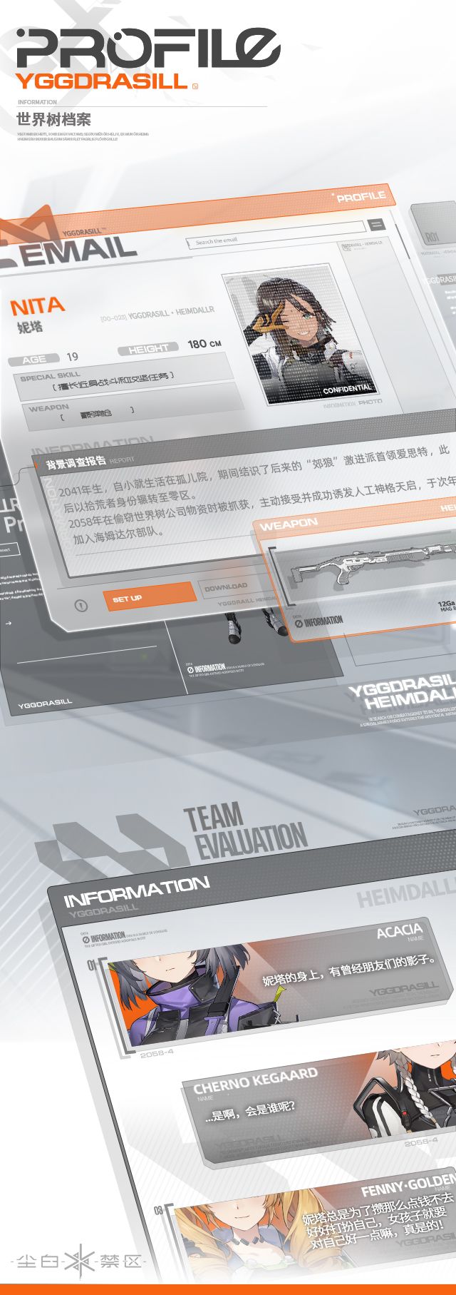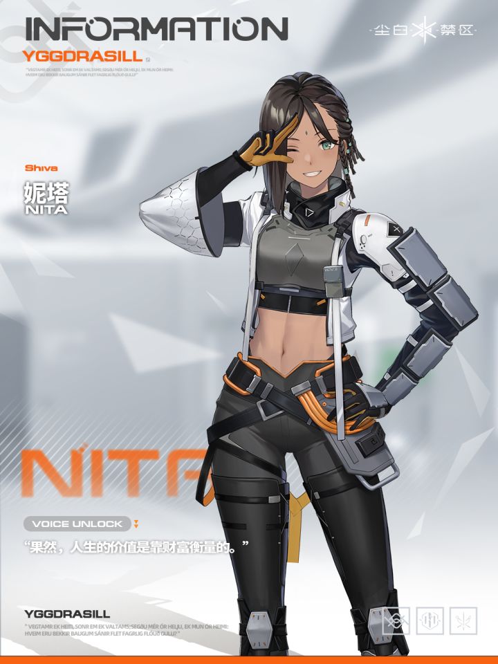 >>新队员情报<<▌妮塔“果然,人生的价值是靠财富衡量的。”_________________出身于底层的妮塔,仅仅生存就已经肩负了常人难以想象的艰难。过去的伤痛使妮塔萌发并坚持了「力量应该用于保护而不是伤害他人」这种略显幼稚的想法。在得知加入海姆达尔可以赚取丰厚薪水后,妮塔主动接受巴德尔抑制剂人工诱发神格天启。头脑并不灵光的她没有太多使命感,努力赚钱,让自己和曾经的伙伴们不再回到地狱之中就是她最朴素的本能。