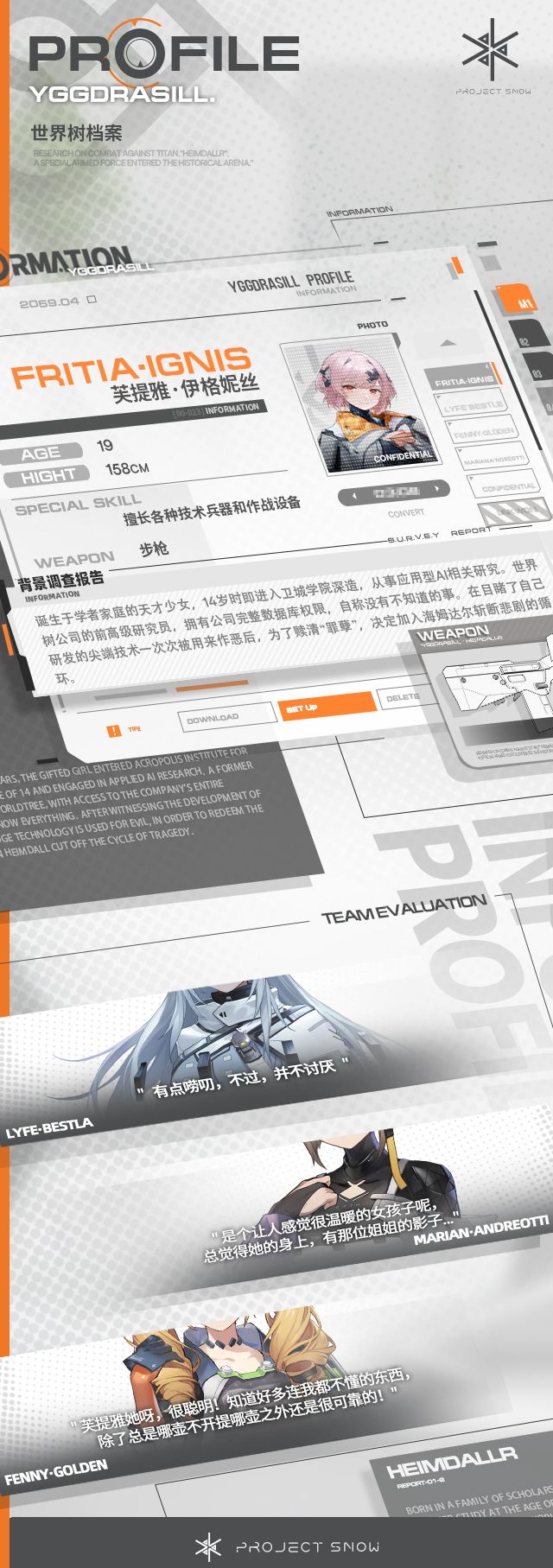 >>新队员情报<<▌芙提雅·伊格妮丝“科技,真的能导向美好的未来吗?”_________________诞生于学者家庭的天才少女,年纪轻轻就已在AI领域深耕。坚信科技应该为人类提供福祉,制作出通用AI引擎“火种”。方便所有人使用AI的同时,也引燃了一场罪孽的山火。强烈的负罪感使她放弃一切去斩断悲剧的循环,可即使如此,她依旧相信,人性本善。