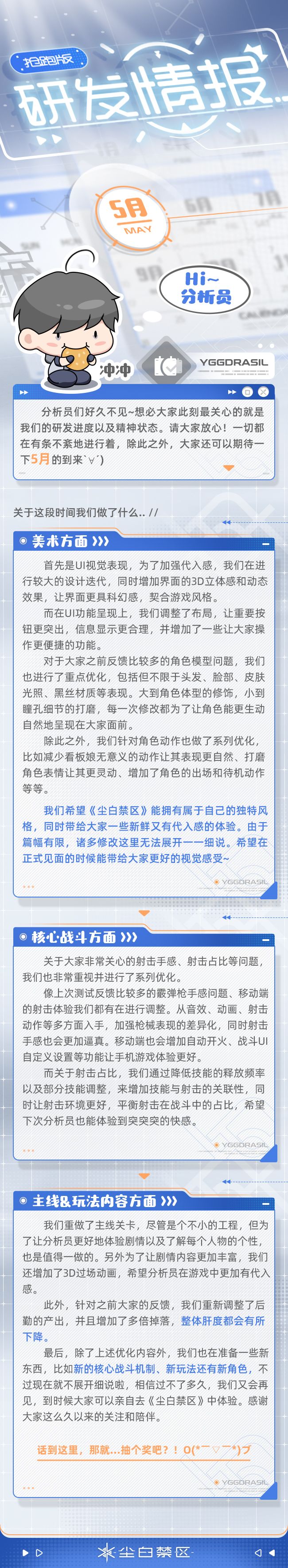 分析员们,在iOS商店开启预约的今天,雪宝也带着最新情报来了!请审阅!▶▶▶情报传输中…听说5月有惊喜~有点小期待呐(⁎˃ᴗ˂⁎)不如大家来猜猜,惊喜会在5月的什么时间掉落吧~A. 5月上旬(5.1-5.10)B. 5月中旬(5.11-5.20)C. 5月下旬(5.21-5.31)》 》 》评论有奖《 《 《在本贴评论留下你对惊喜掉落时间的猜想,雪宝将从中随机揪8位分析员,送出【尘白