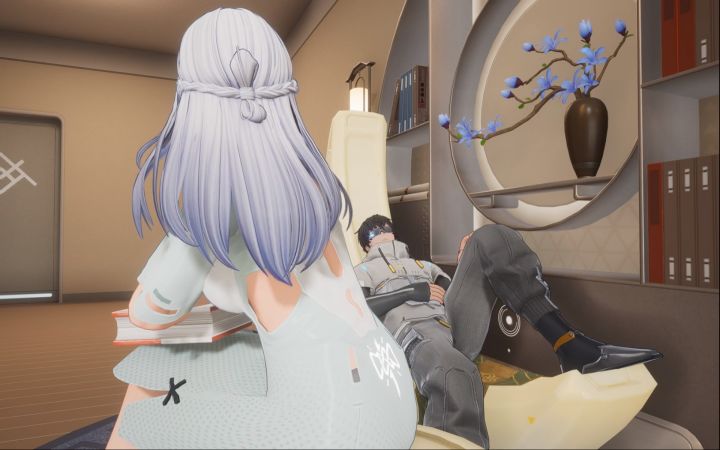 辰星坐在圆凳上,搭起二郎腿,一只手捧着书,另一只手放在书角准备随时翻页。此时,辰星听到了均匀的呼吸声,把头发撩到耳后,抬眼一看,原来是分析员睡着了。见此场景,辰星合上书,撑着头,静静地看着分析员 辰星:(分析员睡着了呢,看来是最近任务繁忙累坏了吧,我还是不要打扰他了,不过这落花配上分析员的睡颜真是一副绝美的画卷呢) 辰星就这样静静看着,眼中满是爱慕和欣赏。 辰星:(凑近点看吧,他在睡觉也不会