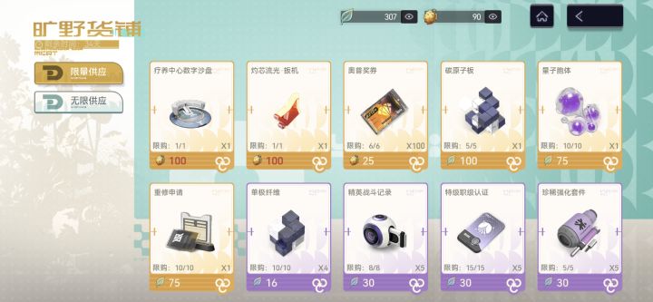 尘白禁区各版本活动商店雷同,以此次「镜中烬火」版本限时活动商店为例,首先活动商店共有两种材料,如图1、2、3右上角所示,其中左边的叶子可通过材料本刷取、活动任务获得,右边的松果仅可通过活动任务获取,需要明确的是,如果你是全勤(版本期间体力刷活动材料本+活动任务全清),那么限量供应的所有物品+紫色武器满改+一定量的后勤刷取均可兑换完。下面我们来简单认识可兑换的各种材料,首先是松果兑换物品1.5张