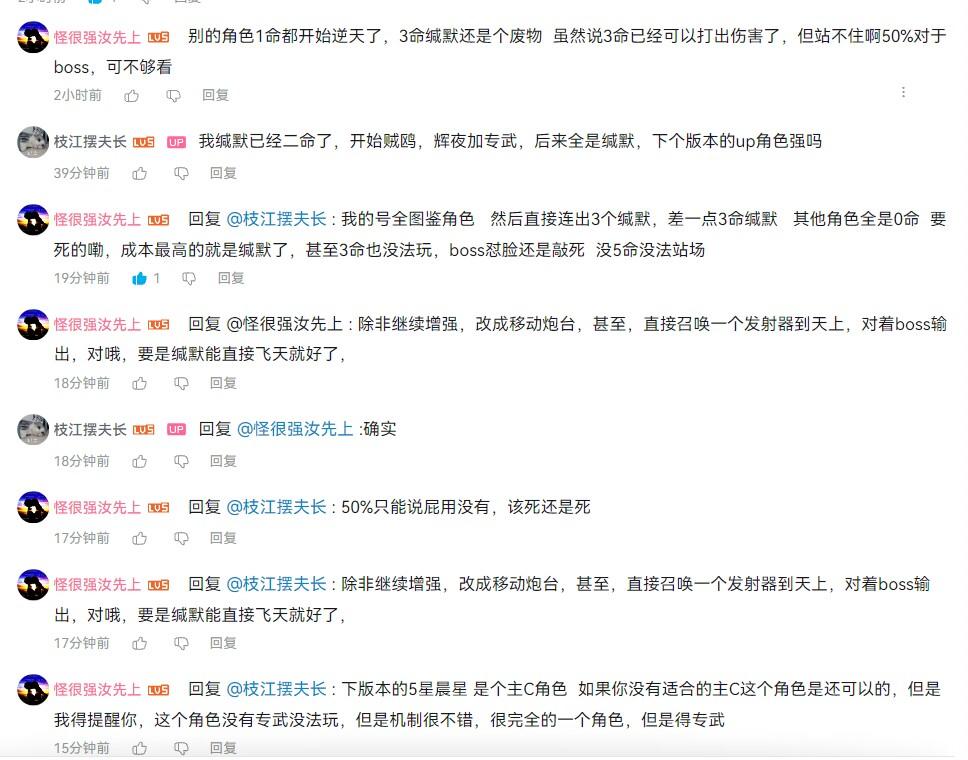 官方你不看看缄默作为一个5星有多么垃圾吗 哪怕你把他伤害在给他提个50%他还是个废物 其他角色1命基本完全体 2命当然比如辉夜 3命诸如狂猎 缄默呢 缄默的提升到底在哪 只要缄默的机制不改她就永远是个沙包 不会真有人觉得BOSS打缄默那个50%减伤盾缄默能抗住吧(PS补充1命确实是实实在在的提升,2命套盾50%没用该扛不住还是扛不住,3命那么抠抠搜搜的回复爆发能量能让我多打1秒还是2秒 4命只能说