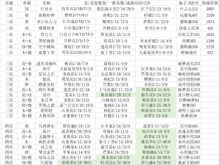 放一个配方集中贴,欢迎补充是目前买过的配方鹿角芽做的挺快,芍药十几花瓣一个,二十秒种出来,瓶子能刷到230上下,目前优级一瓶卖560+高星需要考级才能做