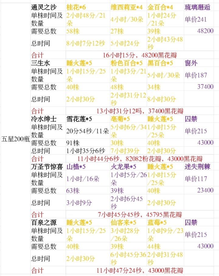 1、单株所需时间及数量是假设无土地加成的数据,也就是一级都没有升级的情况下的。