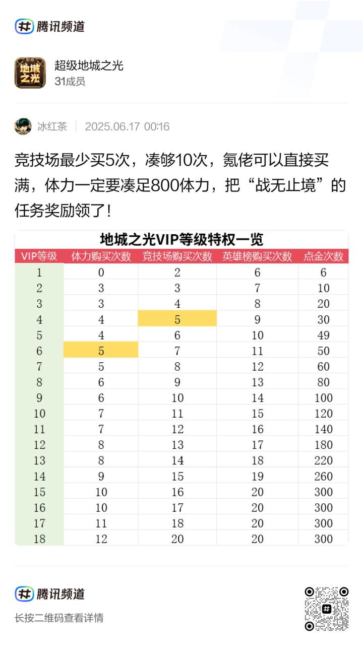vip特权中最重要的就是竞技场购买次数和体力购买次数。所以长期玩得朋友建议最好充到4级。#超级地城之光
