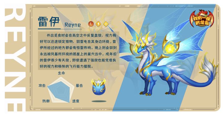 #萌龙小百科#龙名:雷伊品质:传奇龙(L)龙种:天翼种-巨翅遮天元素属性:电系&光明技能简介:一技能【飞翼冲撞】,对敌方造成光属性伤害的单体攻击;二技能【流星冲刺】,对敌方造成光属性伤害的单体攻击,概率眩晕1回合;三技能【天雷滚滚】,概率眩晕敌方2回合,并对敌方造成电属性伤害的群体攻击。#萌龙信息卡#孤崖之上,风暴环绕,鲜有人至;——雷伊的巢穴便筑在这种地方。它们自小与雷电