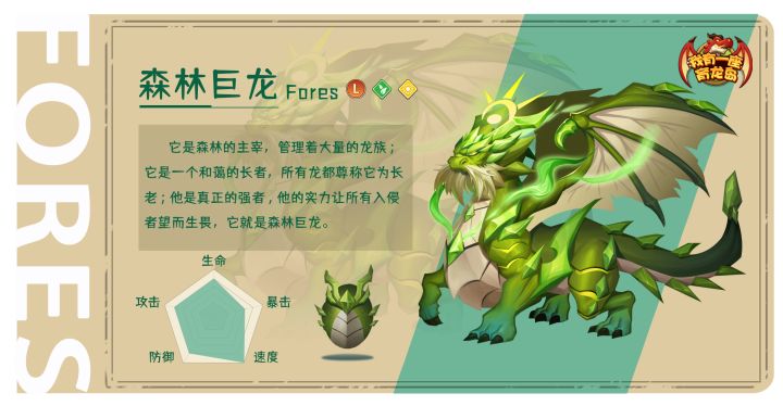 #萌龙小百科#龙名:森林巨龙品质:传奇龙(L)龙种:天翼种-自然之灵元素属性:自然&光明技能简介:一技能【飞翼冲撞】,对敌方造成光属性伤害的单体攻击;二技能【剧毒】,对敌方造成自然属性伤害的单体攻击,并持续造成伤害2回合;三技能【狂怒之风】,对敌方造成自然属性伤害的群体攻击,同时扣除敌方部分行动条。#萌龙信息卡#在新生萌龙的眼中,森林巨龙就好像村里无所不知的老爷爷,所有伙伴都
