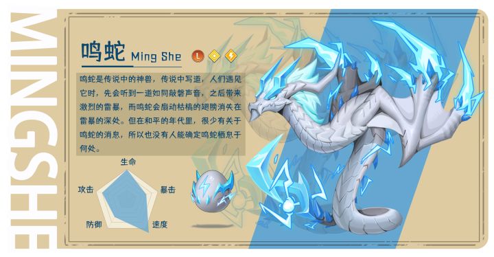 #萌龙小百科#龙名:鸣蛇品质:传奇龙(L)龙种:魅影种元素属性:电系&光明技能简介:一技能【落光】,对敌方造成光属性伤害的单体攻击;二技能【充能】,为友方恢复部分血量并增加其行动条;三技能【鸣声】,对敌方造成电属性伤害的群体攻击,并造成眩晕。#萌龙信息卡#传说,鸣蛇的出现会伴随激烈的雷暴,于是有人虔诚祈求它的现世,企图为贫瘠的土地带来一丝希望。“我曾来过这里,那时还是青山