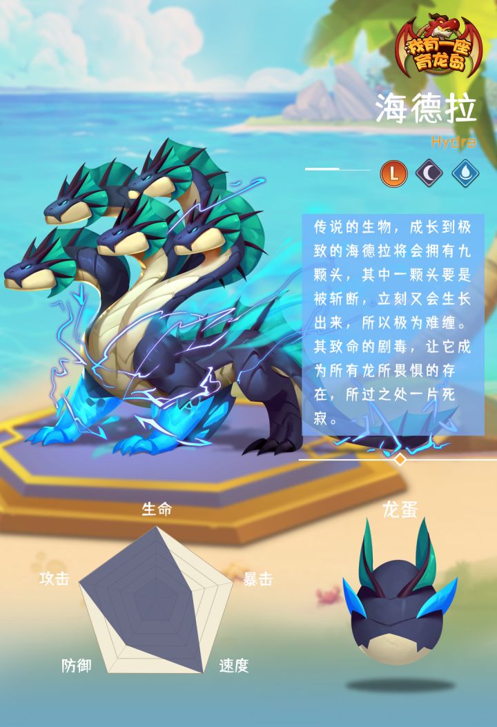 #萌龙小百科#龙名:海德拉品质:传奇龙(L)龙种:魅影种元素属性:水系&黑暗技能简介:一技能【影子球】,对敌方造成暗属性伤害的单体攻击;二技能【毒气流】,对敌方造成水属性伤害的单体攻击并持续两回合;三技能【致命毒雾】,对敌方造成暗属性伤害的群体攻击并持续两回合。#萌龙信息卡#是谁守在死寂无人的荒野,摇晃的身躯投下可怖的暗影,相传海德拉拥有着九头之身,唯有一次性全部斩下才有杀