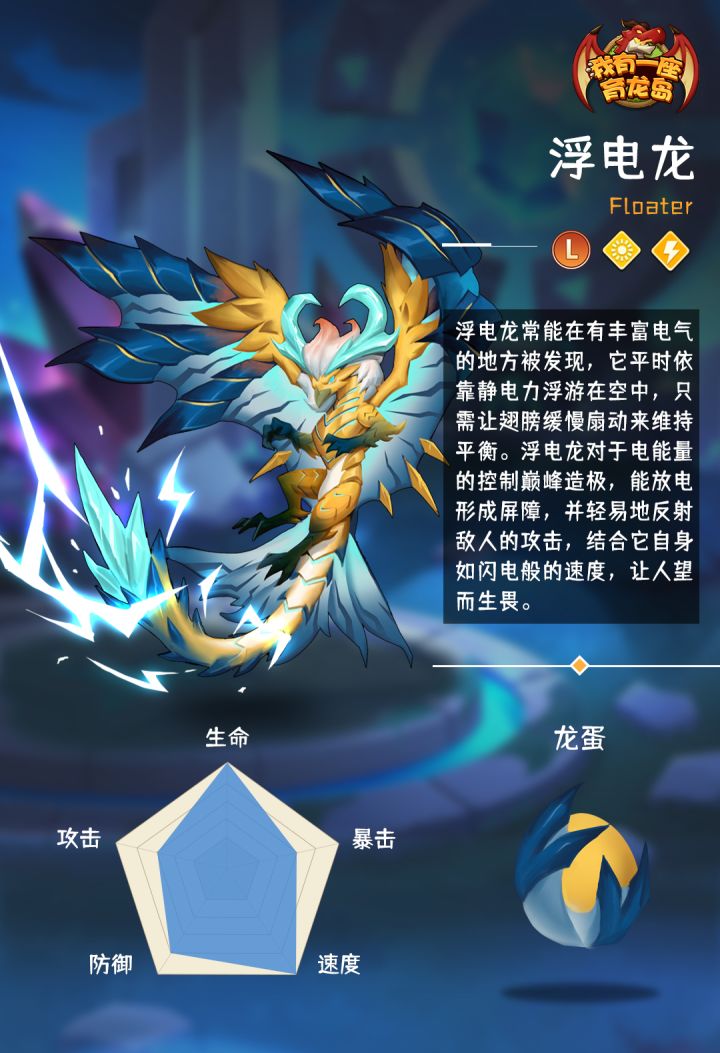 #萌龙小百科#龙名:浮电龙品质:传奇龙(L)龙种:天翼种元素属性:电系&光明技能简介:一技能【飞翼冲撞】,对敌方造成光属性伤害单体攻击;二技能【静电屏蔽】,为己方全体添加护盾,持续2回合;三技能【反射壁】,为己方全体增加反射部分受到伤害的效果,持续3回合。#萌龙信息卡#如果你不想得到一个限定版的龙岛爆炸头,记得离冬天的浮电龙远一点,满身静电的他这时候可是“生龙勿近”。