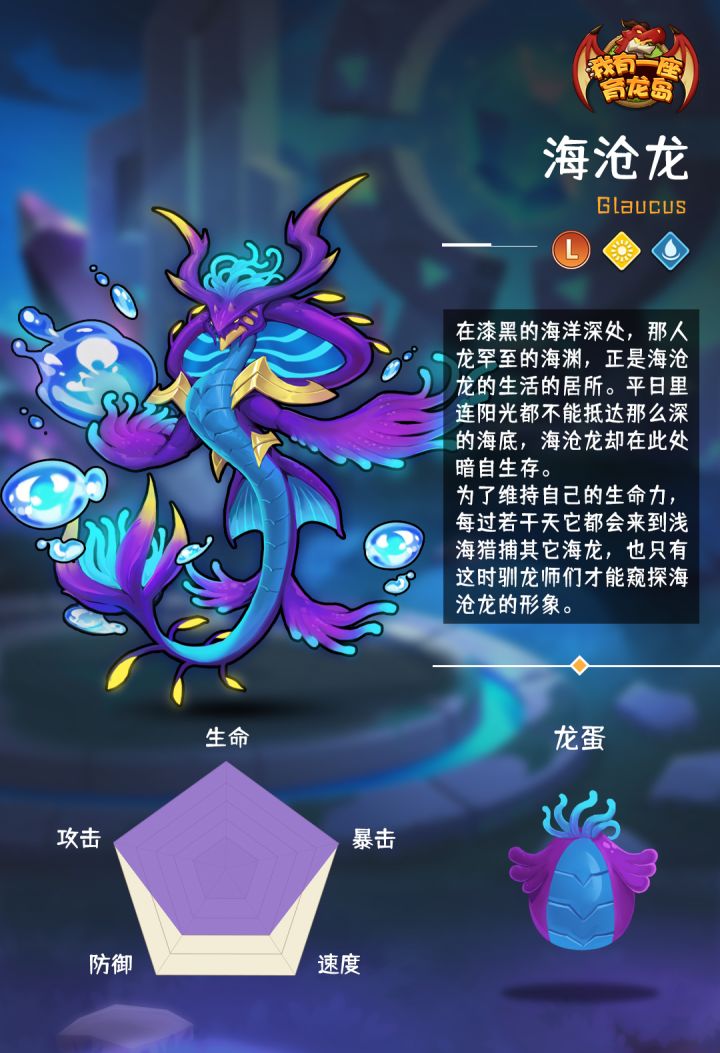 #萌龙小百科#龙名:海沧龙品质:传奇龙(L)龙种:爬行种元素属性:水系&光明技能简介:一技能【落光】,对敌方造成光属性伤害单体攻击;二技能【巨浪】,对敌方造成水属性伤害单体攻击,并驱散敌方增益效果;三技能【大漩涡】,每次造成伤害前清楚目标护盾,对敌方造成水属性伤害群体攻击三次。#萌龙信息卡#光不可至的深海,沧海龙盘踞其间,它守护的是不可名状的恐惧,无法言喻的秘密,隐匿在黑暗