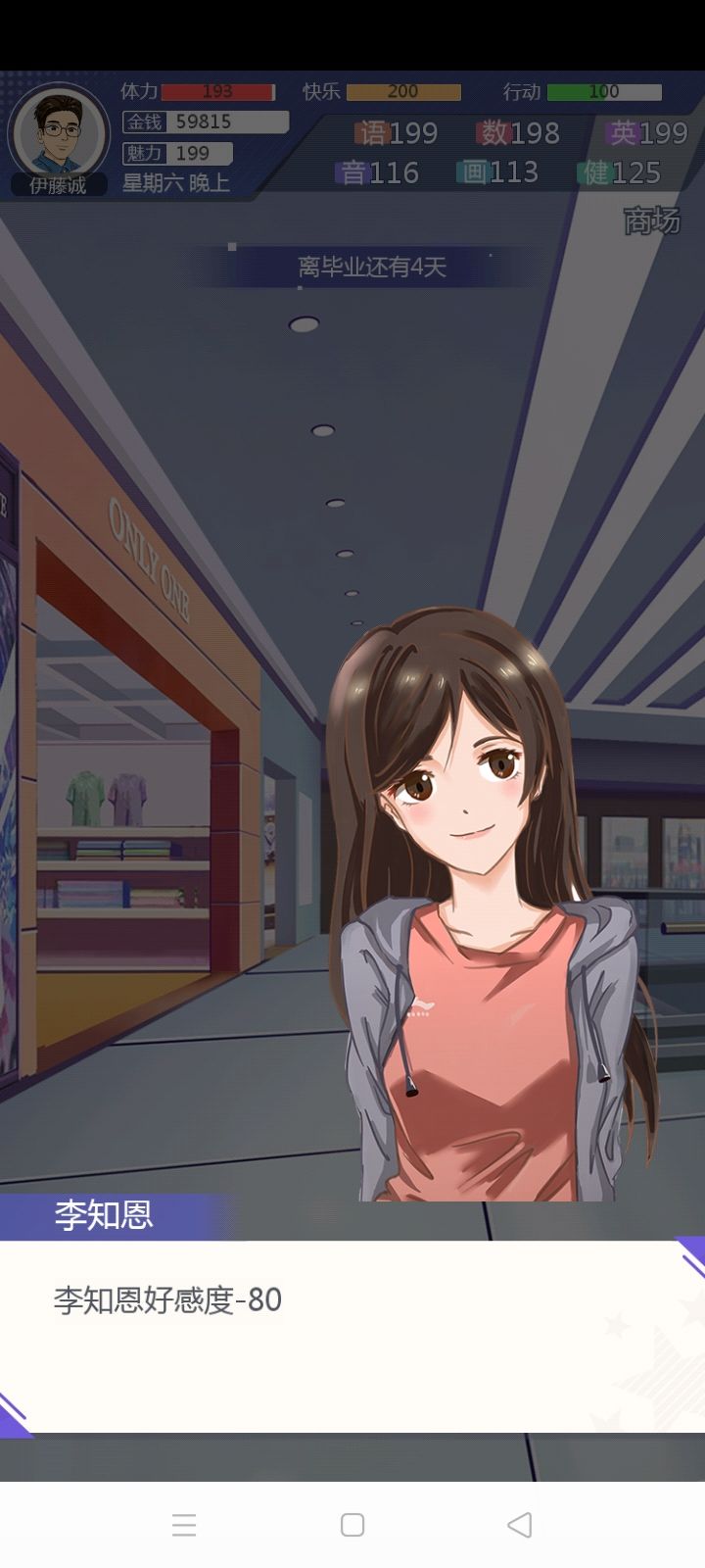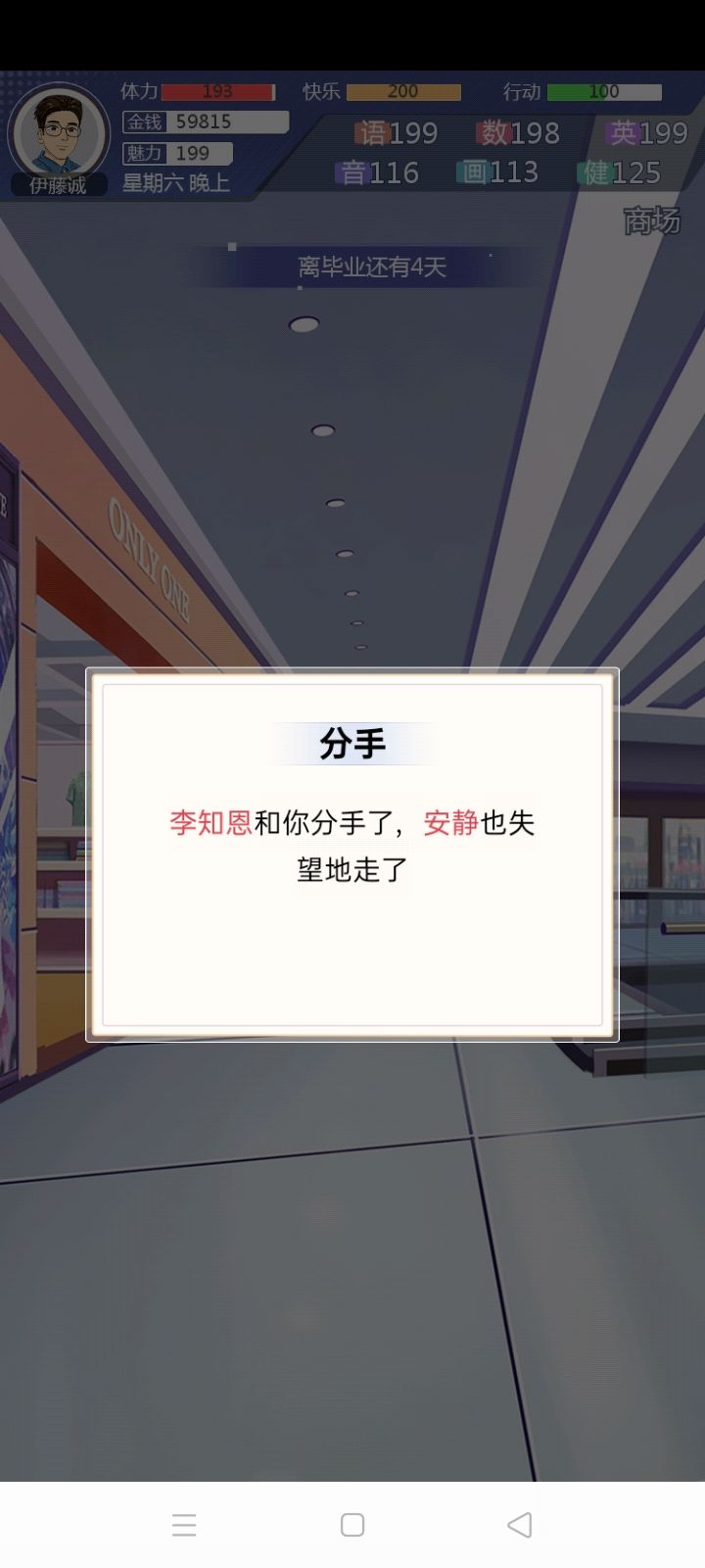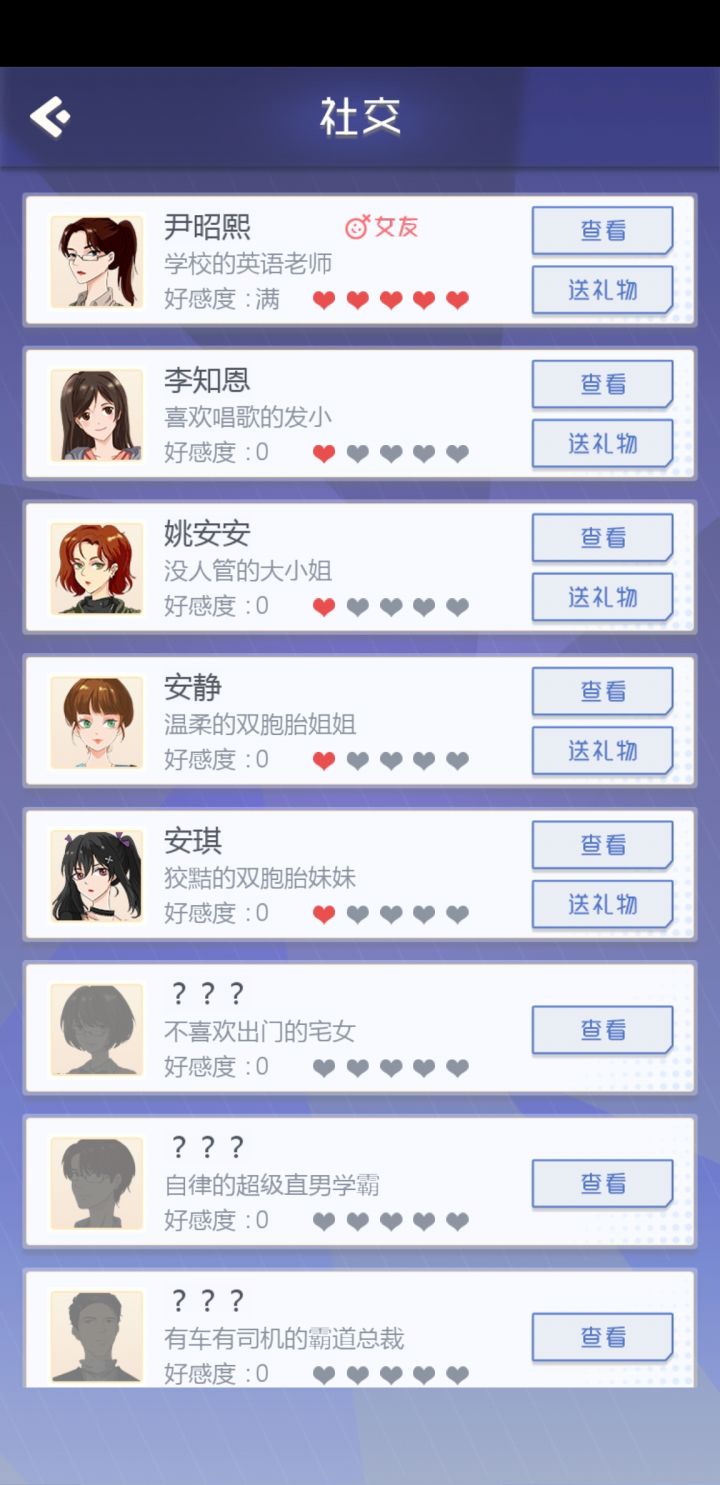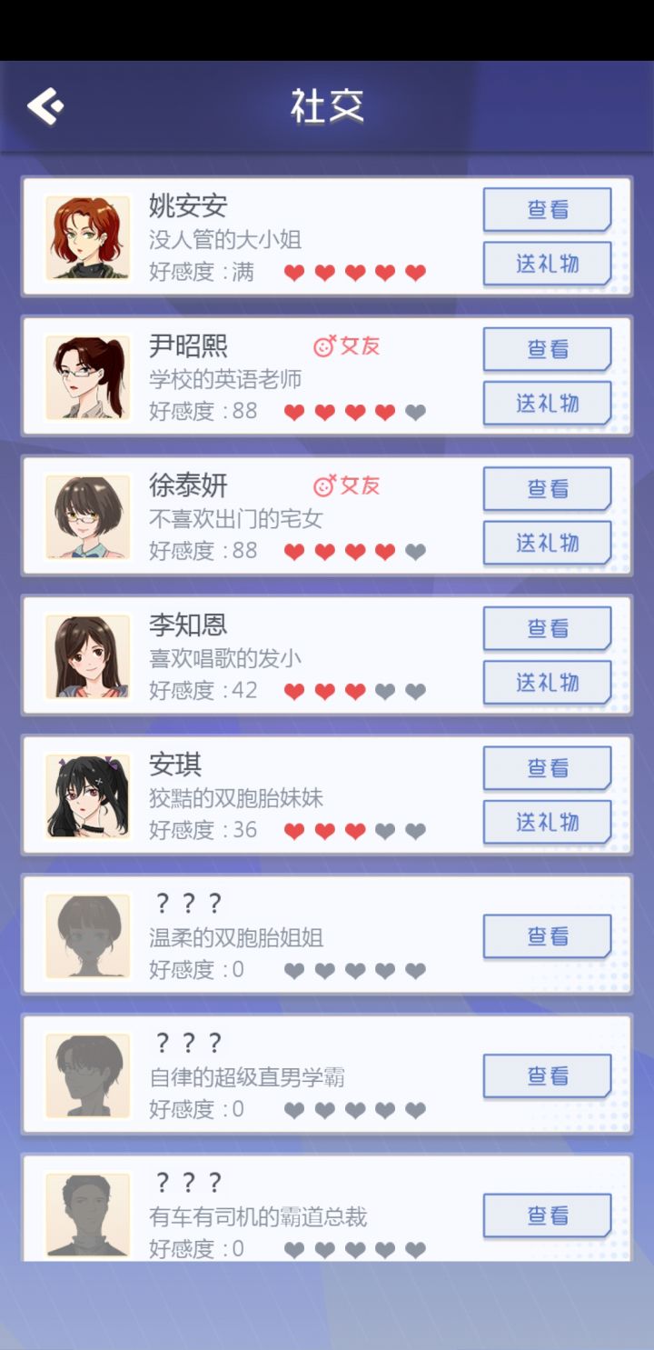 终于成功攻略老师了(晚上开局双女友),个人觉得是因为老师有隐藏属性,健康属性必须要高,再加上明面属性英语要求以及亲密度要求,貌似是这样。补图:晚上又开了一局,安安实在是太难搞了,好感度加的少,约也总不出来,她到最后都没出来,要不然有希望冲三个的。。。