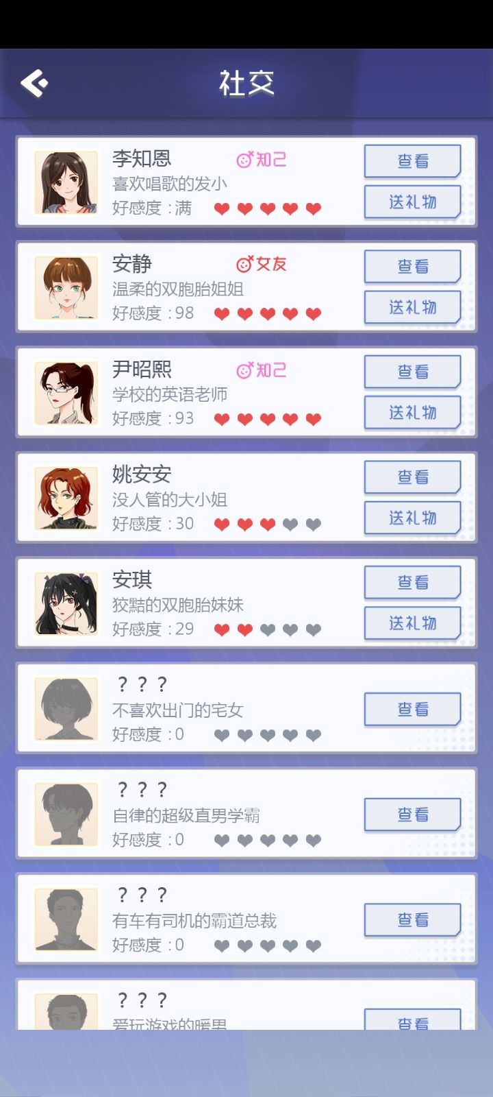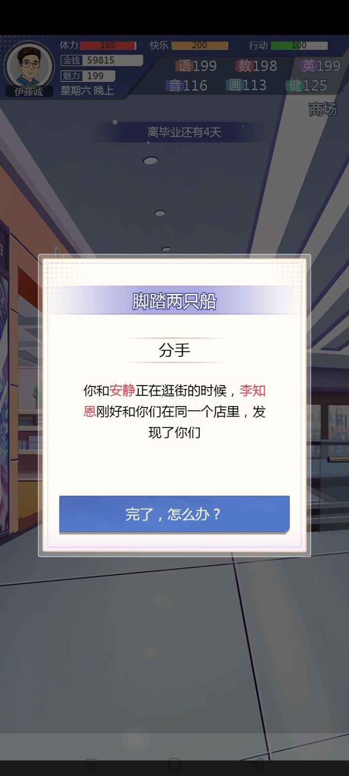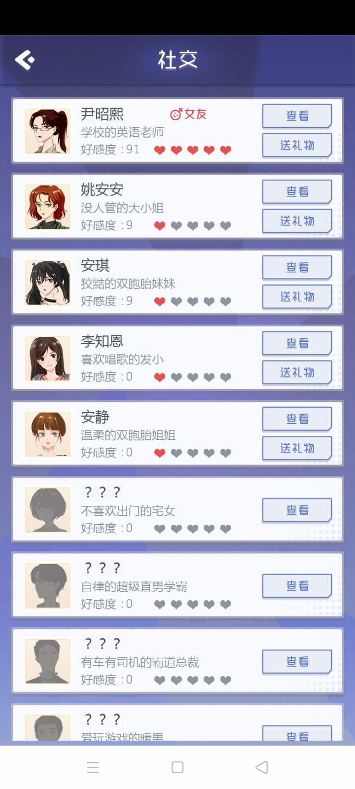 终于成功攻略老师了(晚上开局双女友),个人觉得是因为老师有隐藏属性,健康属性必须要高,再加上明面属性英语要求以及亲密度要求,貌似是这样。补图:晚上又开了一局,安安实在是太难搞了,好感度加的少,约也总不出来,她到最后都没出来,要不然有希望冲三个的。。。