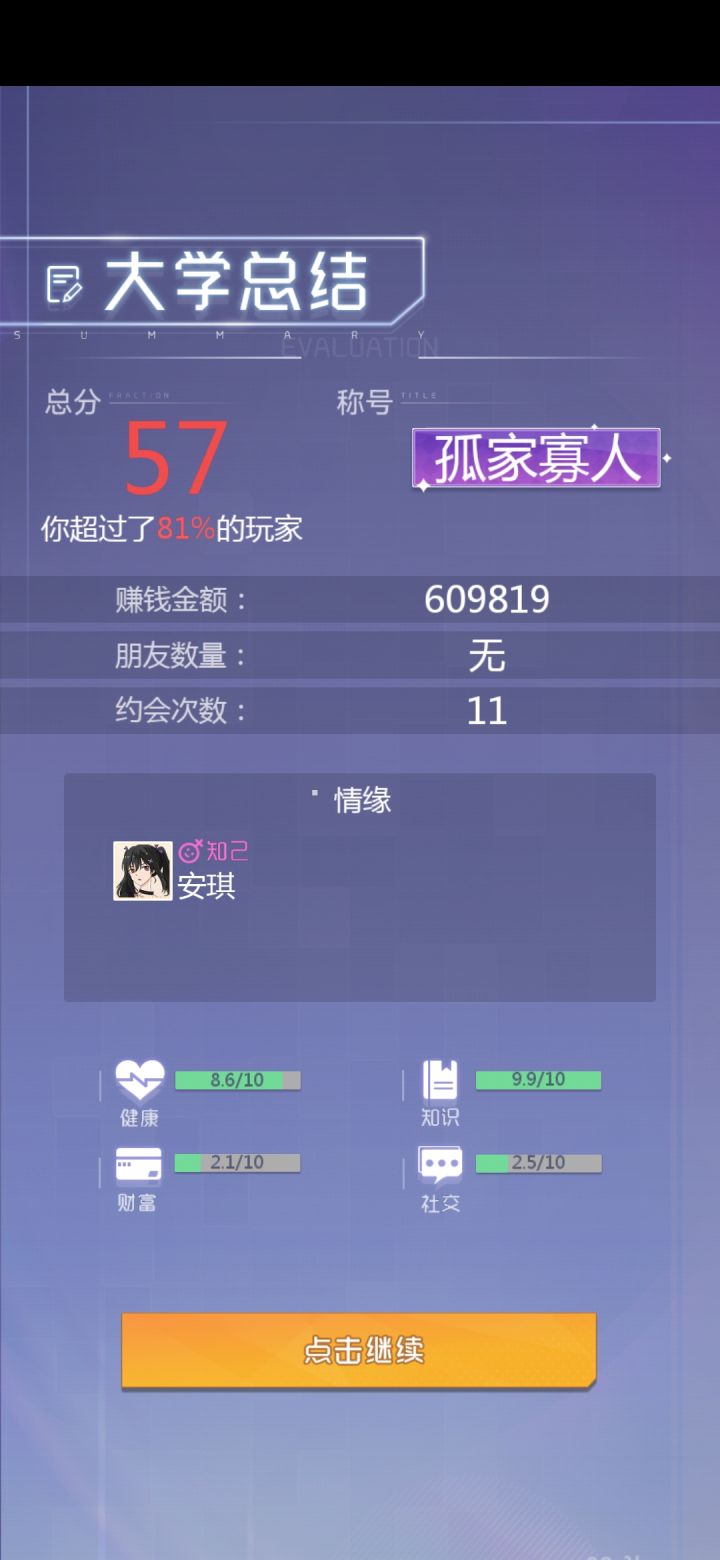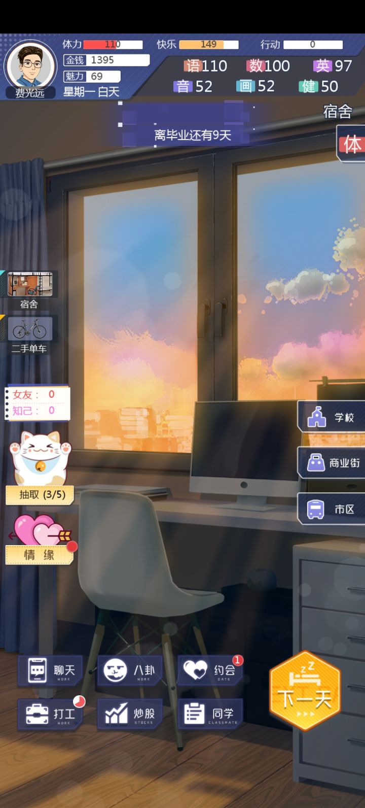 作者要不在哪儿加个存档的按钮吧,有事退出了,然后下一次进去数值一夜回到解放前,辛辛苦苦刷上去的钱也全没了,这事件直接废掉,原本这个妹子是稳稳拿下的,这掉一波数值,直接废掉了,几天好感度根本拉不满(魅力好像是刷了130,语数英各120)