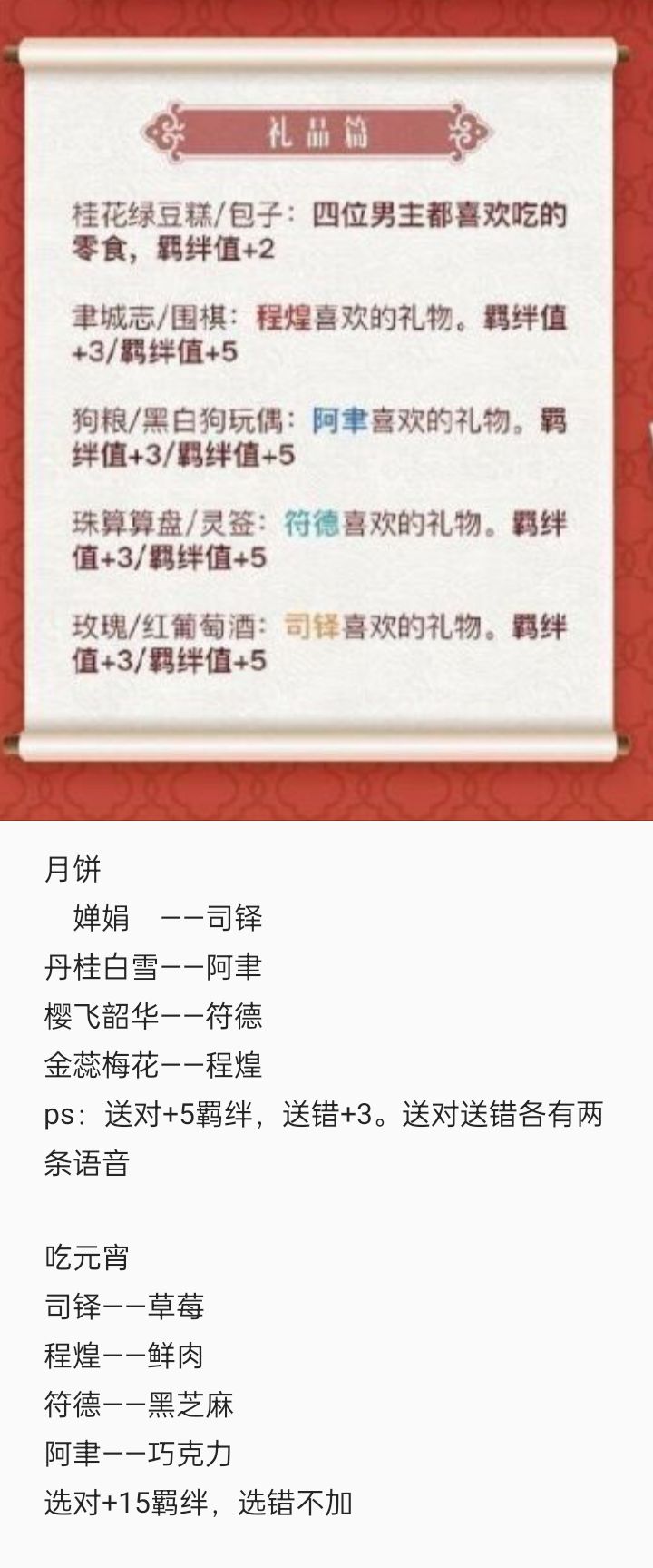 日程攻略,目前最全的应该是(——————————————————————————带上了之前的——————————————————————————补充了主线攻略(图源见水印)——————————————————————————礼物攻略(——————————————————————————月饼和元宵——————————————————————————问之前在图里好好找找😙