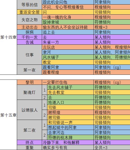我也只是自己瞎总结的,不一定全面如p1,第二十三章的必然中的必然,选长的后面就走程煌和阿聿短的就是符德和司铎。祭灶选聿城,不然一定一定会鼠的二十五章搅局者那里你要开谁的线就选谁后面的话。欣慰,无奈是符德羡慕,被爱是司铎羡慕,被需要是阿聿欣慰,有怨气是程煌程煌不能从二十三章开始开,要从十四章的第一夜开始就开他的线才行!!(啊你们理性的人…感觉想想就是很恐怖的广告量)(所以可以开个