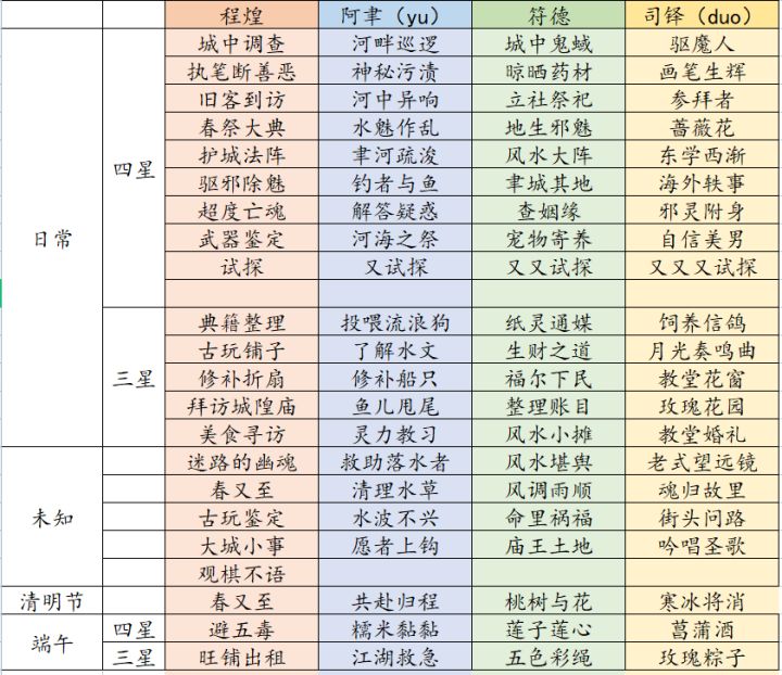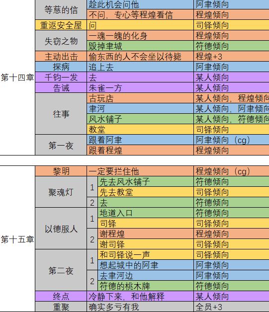 借花献佛,这是之前论坛和微博里太太们做的攻略,再发一次给新来的朋友参考一下。★序章到第15章的攻略(某人倾向是指灶神倾向,这个选项多于2,就会触发死亡结局。意味着如果在“往事”章节想选出司铎以外的选项,那另外三个紫色的选项就不要点错了)★每位男主的日程任务选项