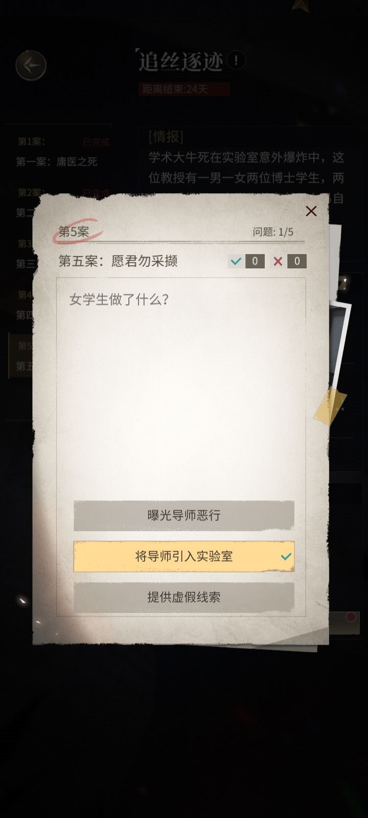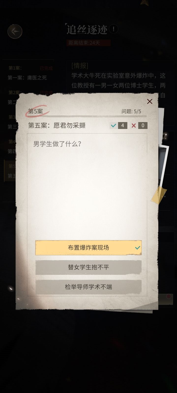 第五案将导师引入实验室周三甲方法对乙物质影响研究二者都有布置爆炸案现场(居民区2学校6)