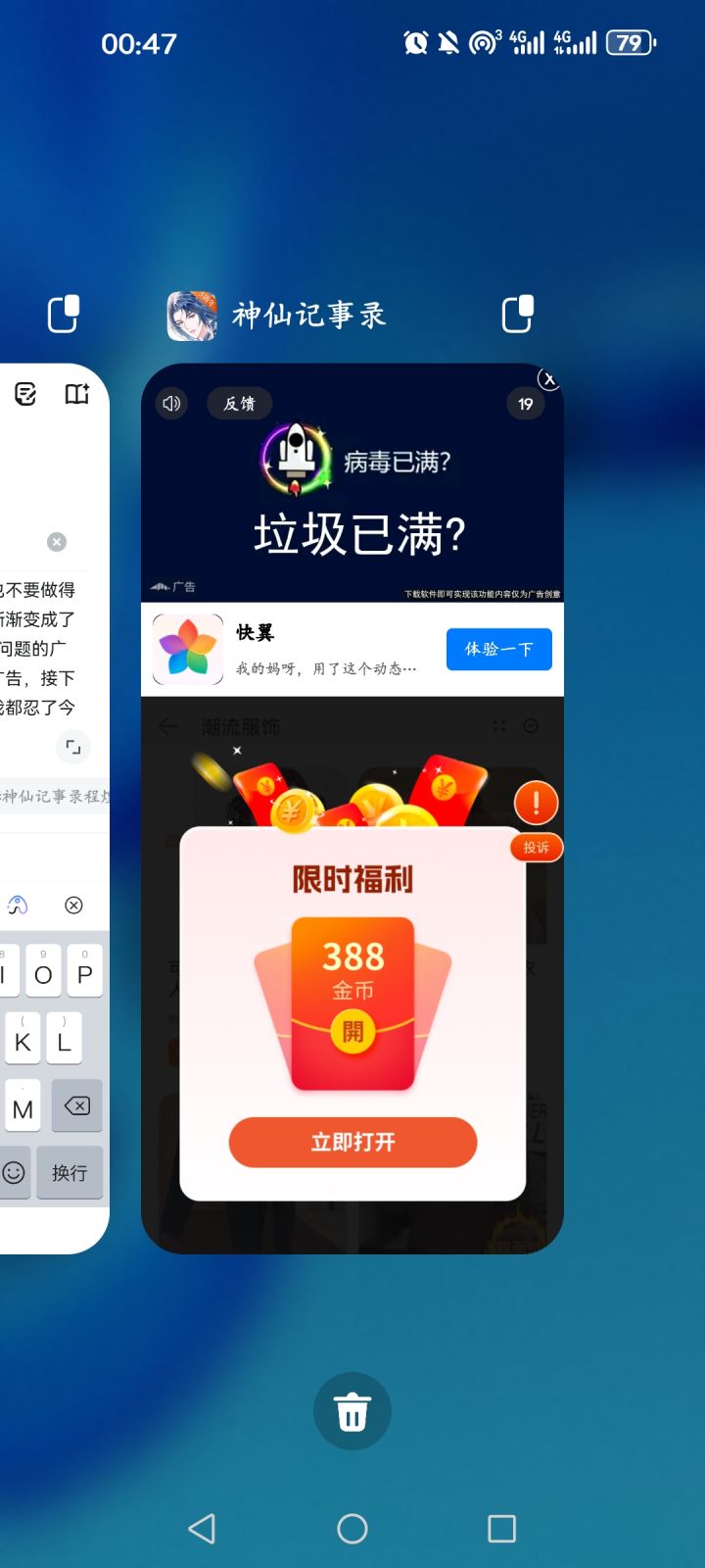 玩了差不多三年了,一直蛮喜欢剧情和玩法,想必此后也会一直玩下去并推荐给别人。但是我真的想说一下…你们引进广告的时候,也不要做得太过分了吧?三年前是普通的广告,渐渐变成了广告中间会卡住要点击x键或者是回答问题的广告,再后来是需要下滑才会倒计时的广告,接下来是看五秒之后要点击的广告,这些我都忍了。今天晚上刷新任务的时候跳出来的广告(配#神仙记事录 图),忽然给我跳转到应用商城和奇怪的页面,我习以为