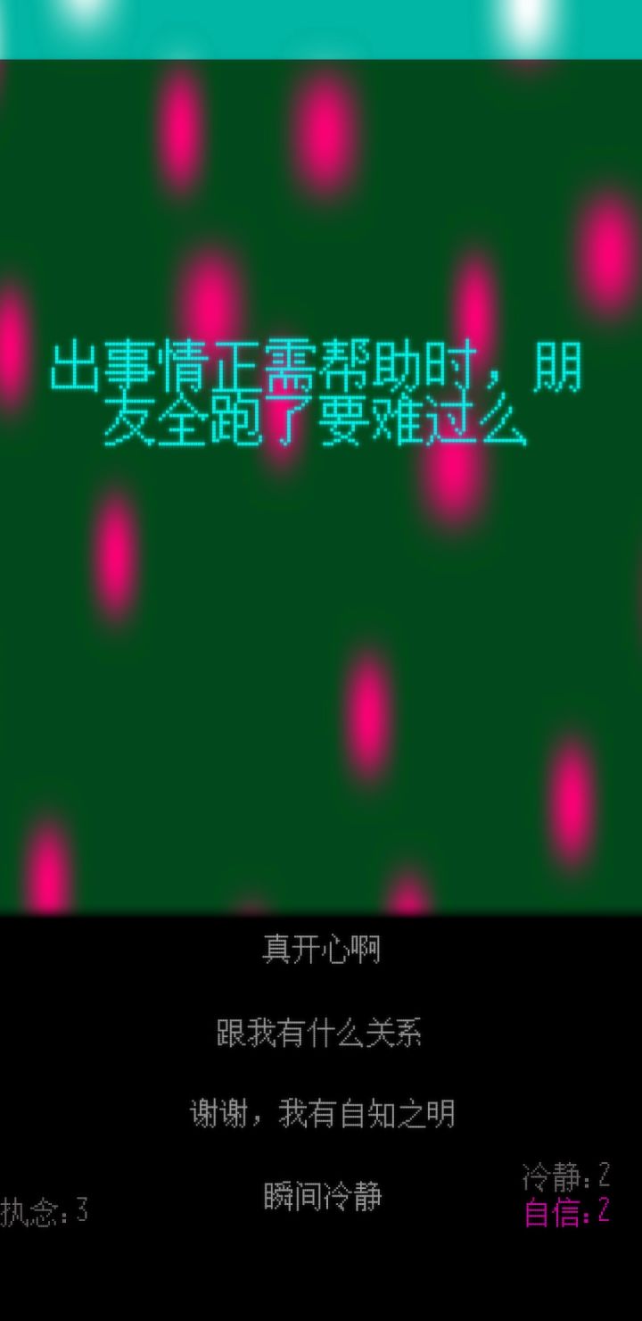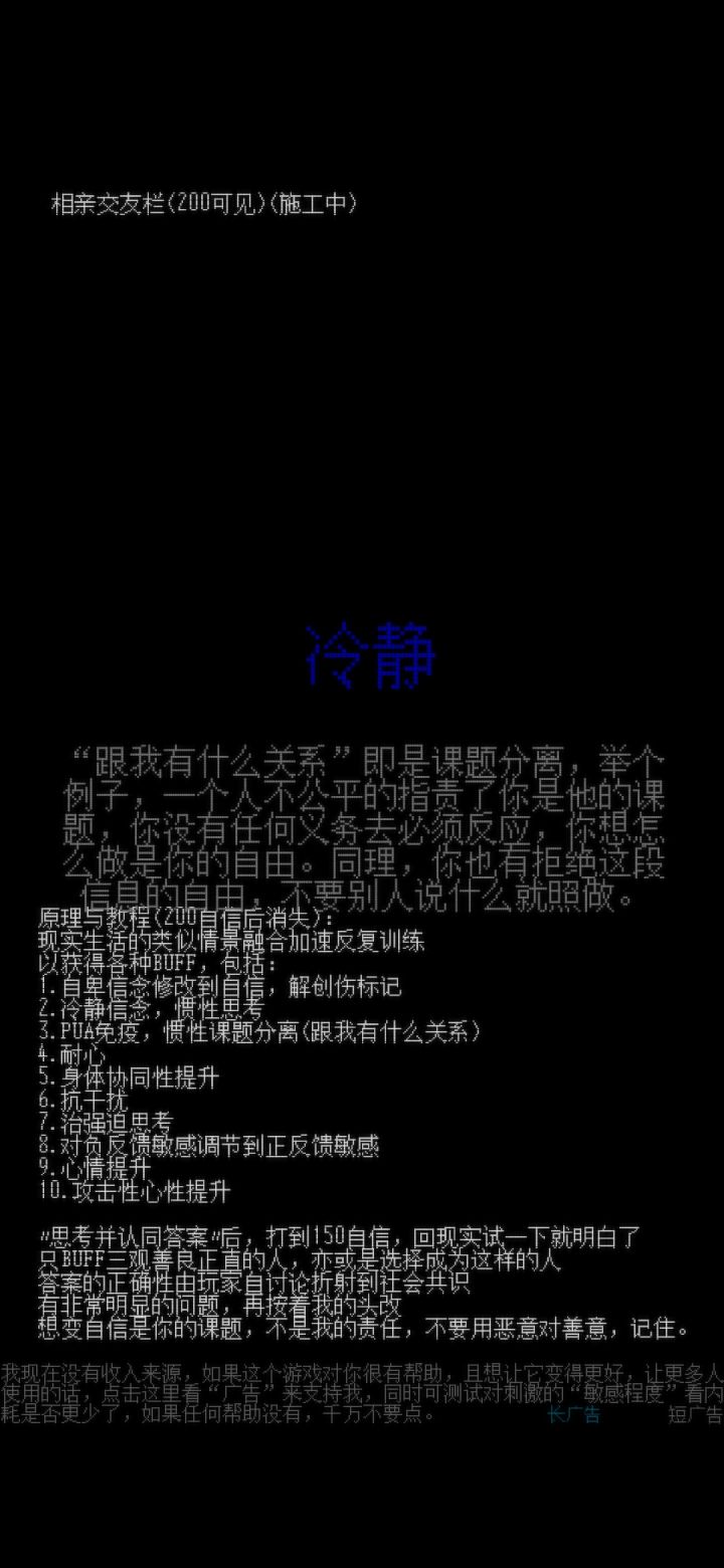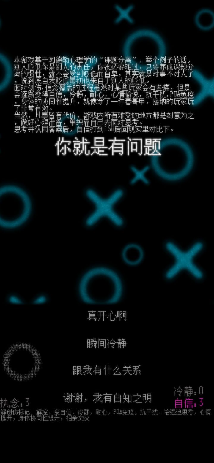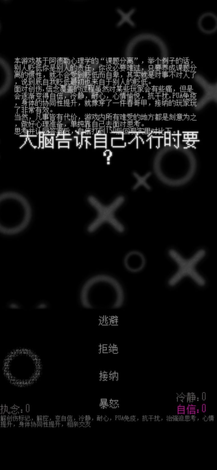 看了很多帖子,也进去玩了两分钟游戏。觉得这个软件不能叫游戏,游戏要有很多结局,但这个属于作者强制给你结局。一种只保留这个观点玩下去,一种有其他想法结束游戏。对于一些有严重自信方面问题的人来说应该挺有用的。重症还需猛药医。但对于普通人来说,玩起来很难受,会有一种你在教我做事的感觉?这个是软件我给4星,因为还有可以改进的地方。是游戏我给两星,不是一个合格的游戏。