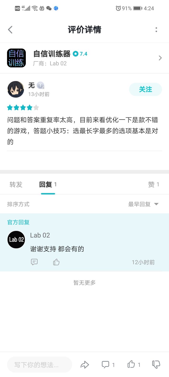 玩过游戏后也看了评论,个人认为可以把“跟我有什么关系”这句做一些更改,可以参考以下回答。希望自信训练器越来越好。😁