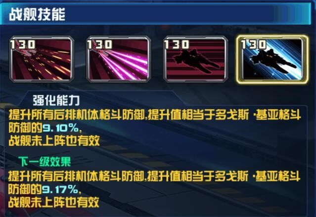 在《敢达决战》游戏中,指挥官等级到达80级后,就会开启战舰系统。战舰也是阵容搭配里重要的一环,不同的战舰有不同的技能,会对战场局势产生不同的影响。目前为止,所有战舰在六星后开启的四技能都为被动的强化技能,即使不出战也有效果。那么就让我们今天来集中的看一下吧!技能介绍:多戈斯·基亚(130级时技能效果)提升所有后排机体格斗防御,提升值相当于多戈斯·基亚格斗防御的9.10%。战舰未上阵也有效歌