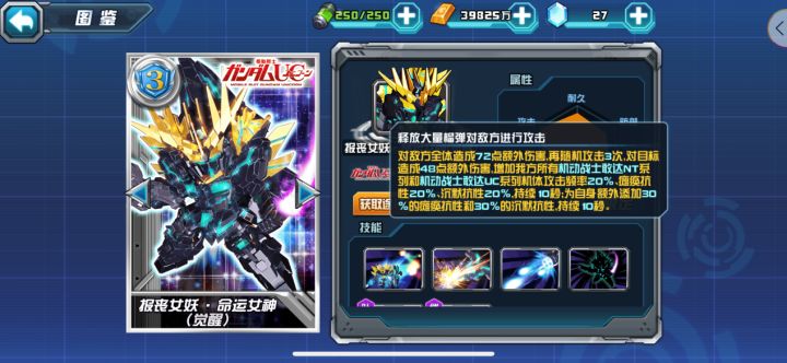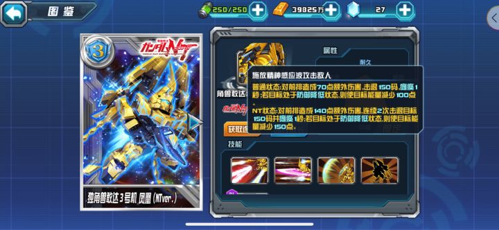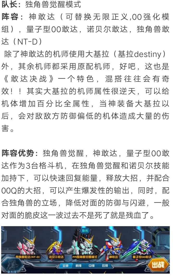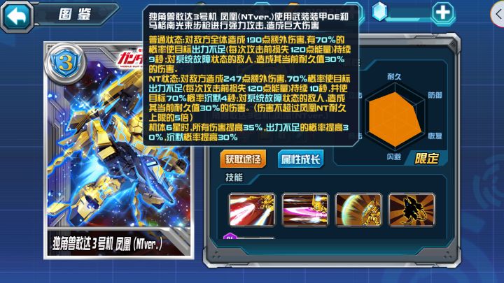 勤劳的小记者来咯,替指挥官们汇总了下目前《敢达决战》游戏中部分主流机体拥有的技能状态,以便让玩家更清楚的了解技能与快速搭配机体。技能状态出力不足(每次攻击前损失X点能量)带「出力不足」效果技能的主流机体:独角兽敢达3号机 凤凰(NTver.)(限定,敢达,射击,后排,浮游,多模,主角)技能1:共鸣之力技能4:金色的不死鸟神敢达/明镜止水(典藏,敢达,格斗,前排,多模,主角)技能1:夏