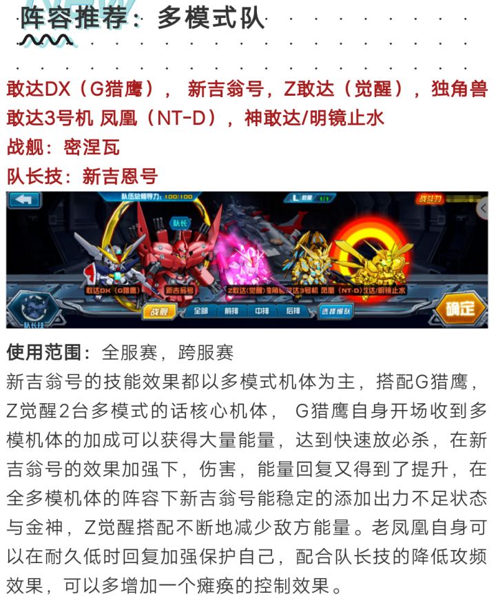 勤劳的小记者来咯,替指挥官们汇总了下目前《敢达决战》游戏中部分主流机体拥有的技能状态,以便让玩家更清楚的了解技能与快速搭配机体。技能状态减少、降低对方能量带「减少、降低对方能量」效果技能的主流机体:独角兽敢达3号机 凤凰(NTver.)(限定,敢达,射击,后排,浮游,多模,主角)技能3:精神感应波攻击GN武装TYPE-E 能天使(限定,敢达,格斗,前排,大型机,多模,主角)技能3:快速