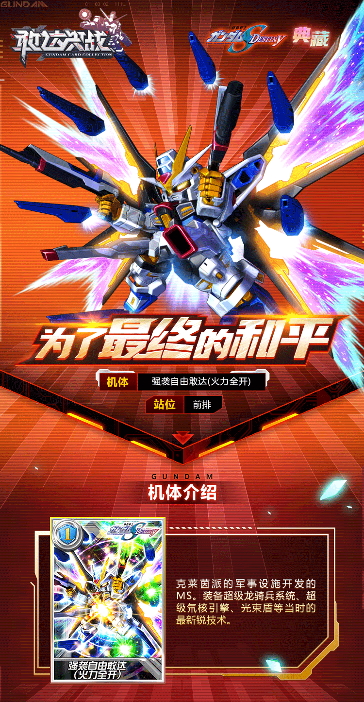 春节未至空气中却早已弥漫腊肉、酱鸭的味道了每个人的脸上都提前充满了过年的喜悦在这欢乐气氛中小记者带着重磅消息来咯!虎年首台「典藏」机体强袭自由敢达(火力全开)即将登场恭贺新春!—✦✦✦—先来看下机体介绍吧。