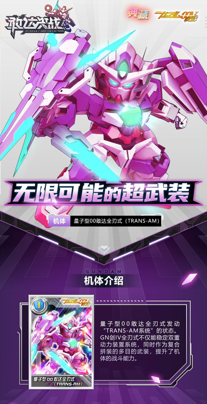 新纪元2周年预热活动已开启登录游戏有好礼全新「典藏」机体也已准备就绪无限可能的超武装量子型00敢达全刃式(TRANS-AM)即将抵达敬请期待—✦✦✦— 先来看下机体介绍吧。