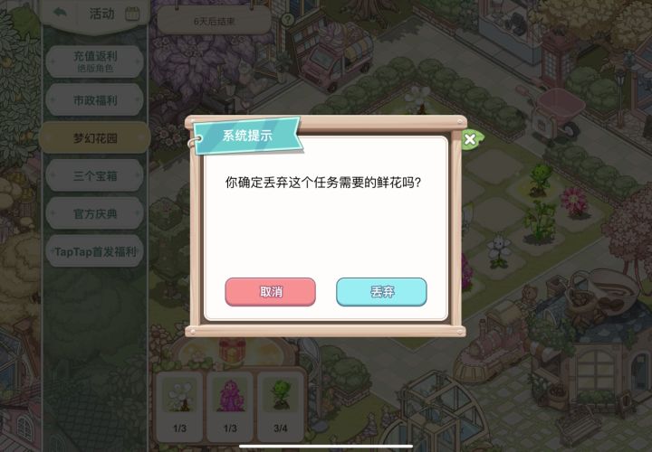 看到好吃城主在发帖子说这个没空了点击不了(我这个是例外),其实旁边有一个粉色的手推车,就像是一个垃圾桶,把没有的鲜花扔到手推车里,接着点丢弃,就完成了#攻略