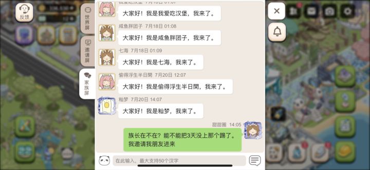 也不算个bug,算是个建议吧。能不能完善聊天系统?和好友都不能私聊。还有聊天能不能艾特那个人。我和族长说把3天的人踢了,我邀请好友进族。她35分钟前还上过线。愣是没看见我叫她。能不能设置和好友能私聊。和族员能私聊。还能建群拉几个好友一起聊?只能在世界聊我感觉我在玩单机啊。