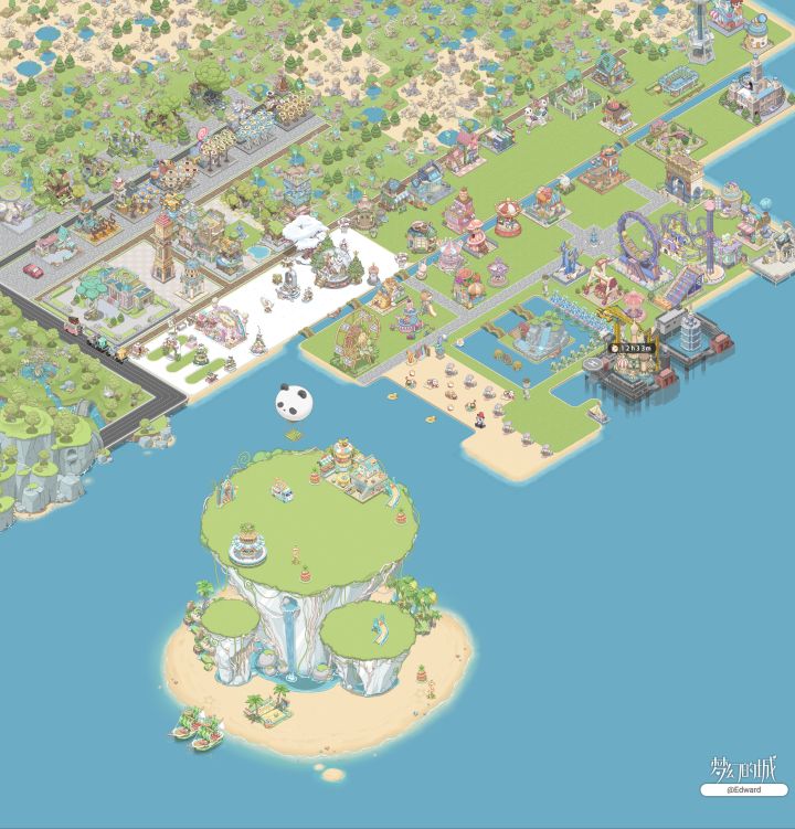 #梦幻的城# 岛上的花坛和草地都布置成水果的形状,如草地上长出的巨大草莓,花坛中开放的色彩缤纷的水果花朵。阳光透过树梢照在岛上,形成斑驳的光影,为整个海岛增添了一份神秘而迷人的氛围。#梦幻的城治愈之旅