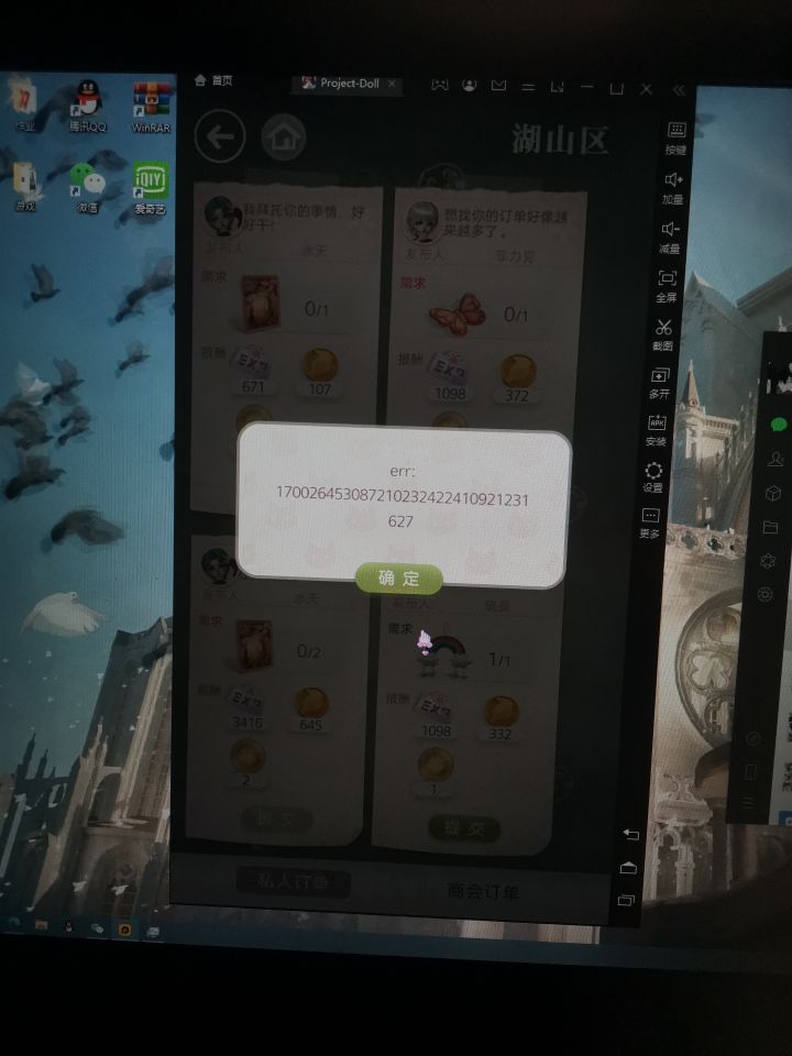 【游戏ID】HX4RVKFGTM01【游戏玩家名】羊崽醒了【BUG/意见描述】点击右下角订单时报错error【设备型号】 电脑模拟器【联网方式(4G/WIFI)】 【联系方式】(qq)256740687【游戏截图/录屏】