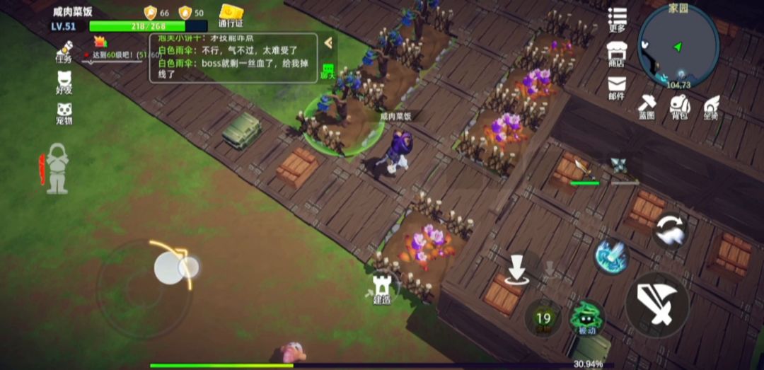 游戏一开始,建议老手玩家离开新手村地图,直接进入家园。(不过有些新手任务可能完不成)把这个地图里面的树果子石头全部采完,可以到达3级,这个地图没有怪物,非常安全。之后马上造好木地板(大部分的工作台都必须建造在地板上),放好木材加工器,将松木放入工作台制作成松木板。松木板制作好后,点击这个图标将加工好的松木板拿入背包。有了松木板后,马上造1-2个储物箱,将包中的东西分类放在储物箱中,游戏背包