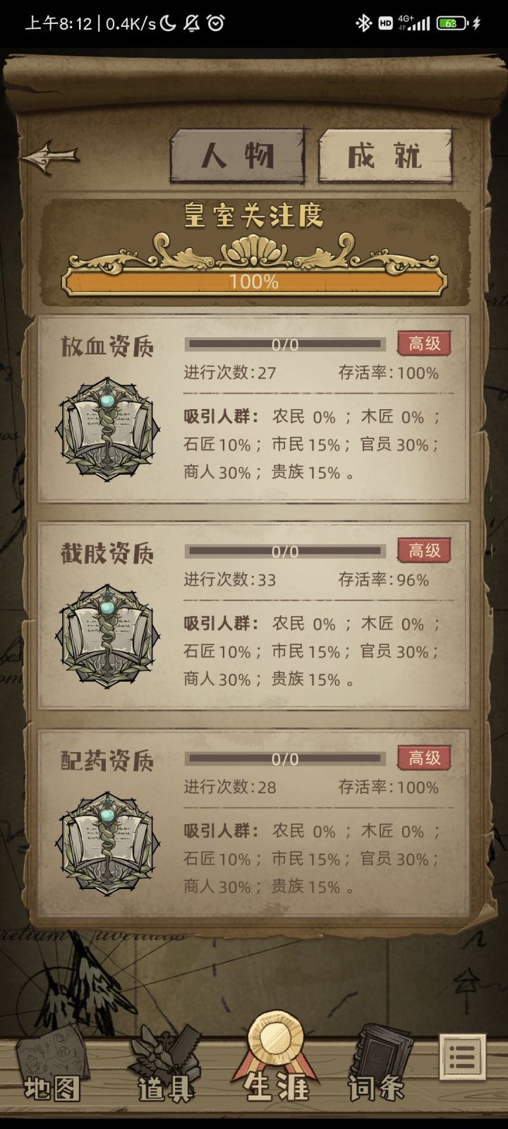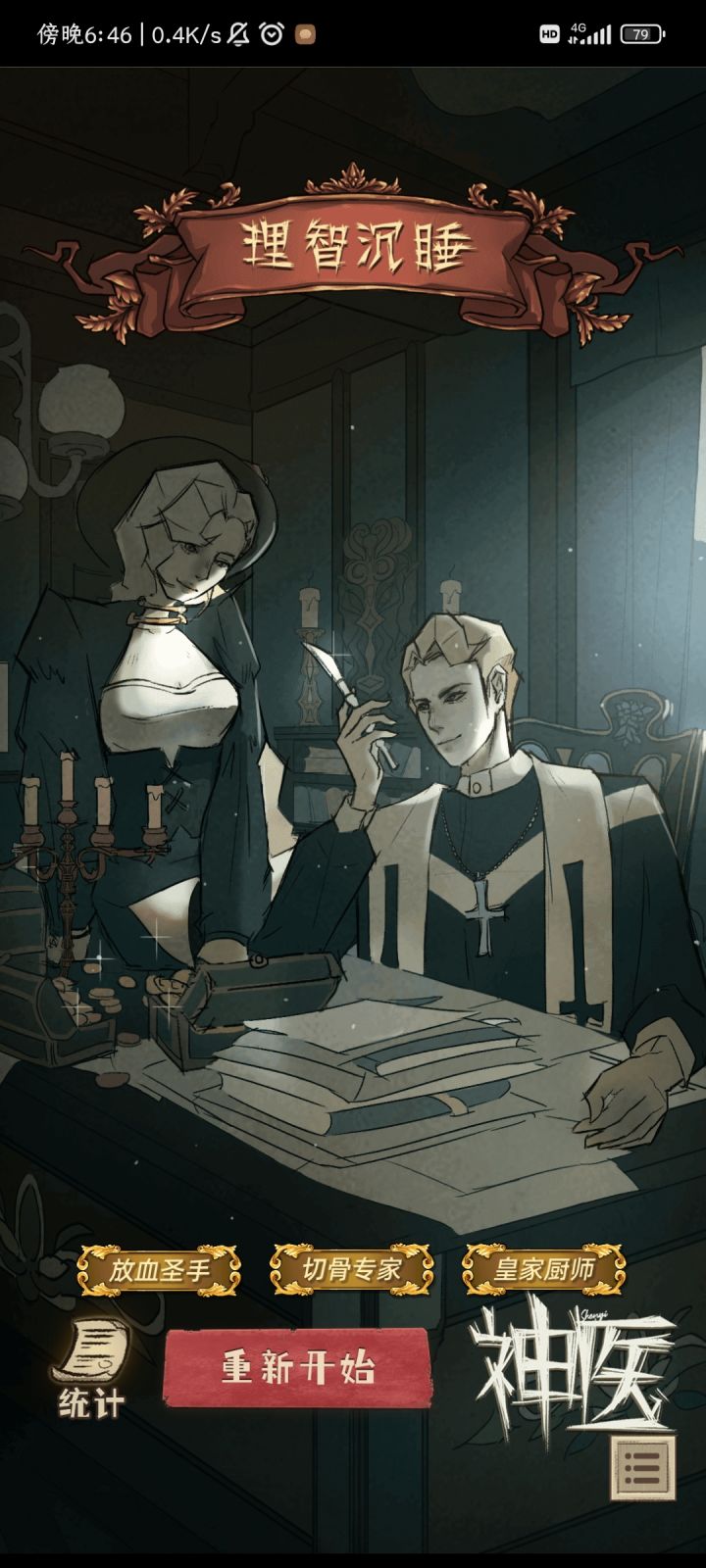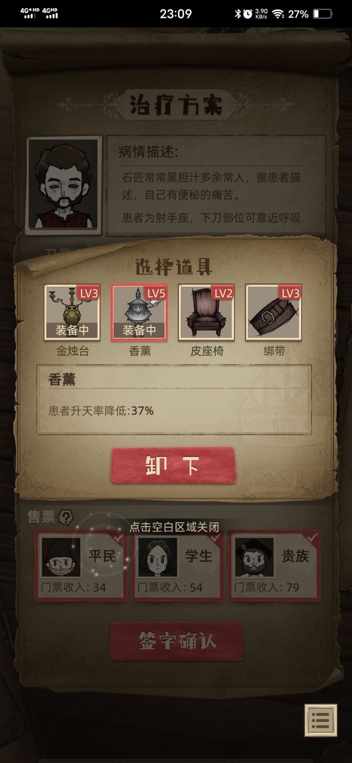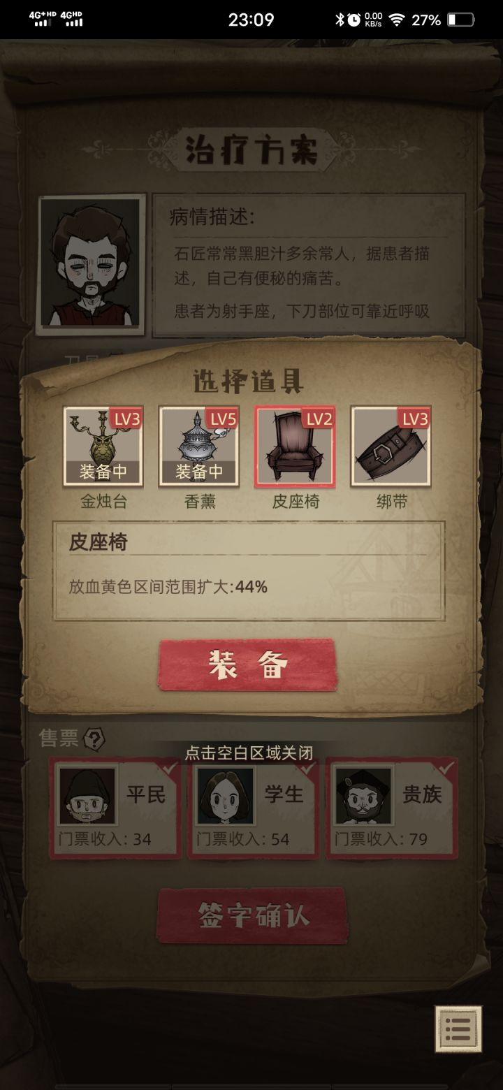 前期可以放血赚一点钱,第一轮用水蛭放血就能拿一千多一次,但后来如果没观众赚的就很少了。刀升级攻击力高点的,我升的是分离式刀,这样两刀结束病人状态减的少一点。下面升级绑带和金烛台不然后期不好过。当然我是不想患者升天,无所谓的刀可以升级银刀(老师死后得到),下面的看需求升。
